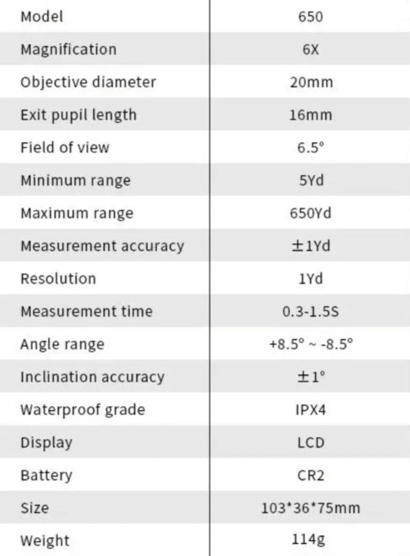 - Mælingasvið: 5–600 metrar / 650 yards