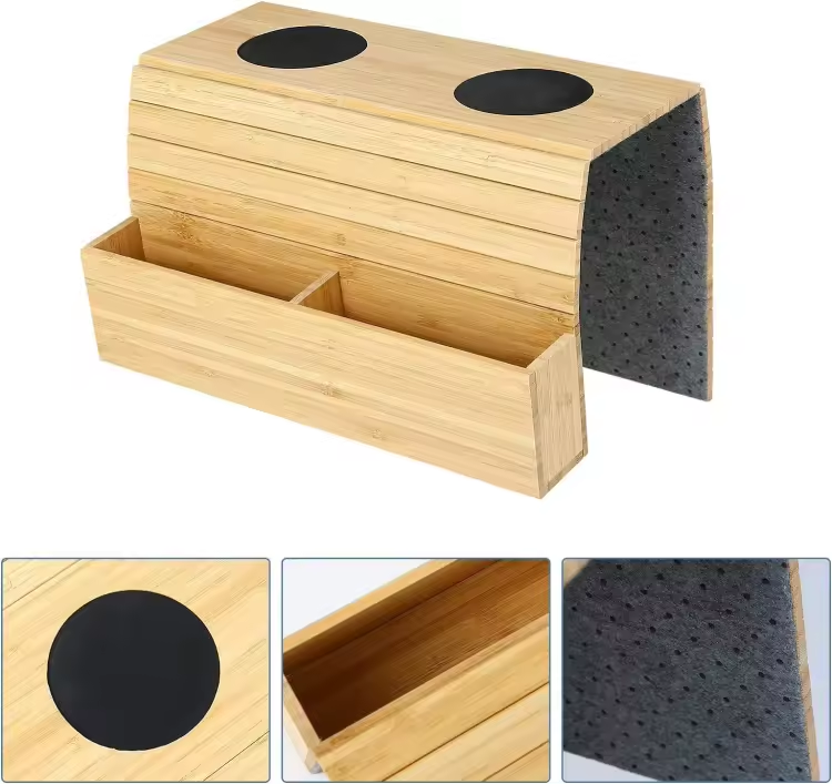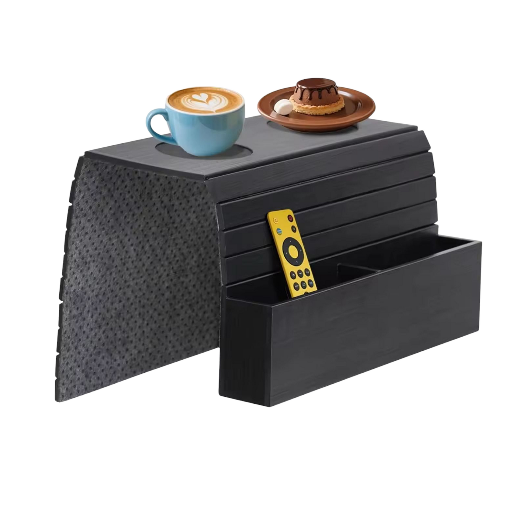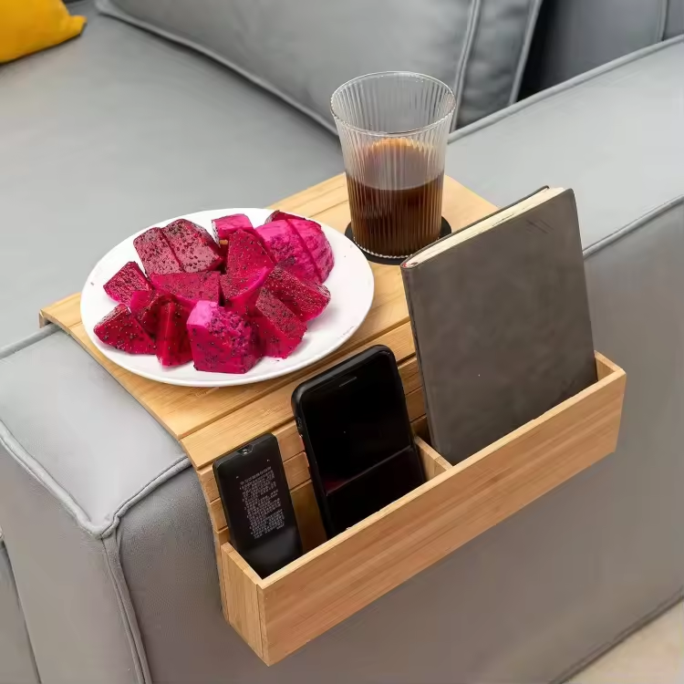 Hágæða bambus skipuleggjari sem er samanflettanlegur svo hann henti sófa örmum af öllum stærðum og gerðum. Að ofanverðu eru tvær sílikon mottur undir glös í einangruðu hólfi og tvö rúmgóð hólf á annari hliðinni þannig auðvelt sé að geyma fjarstýringar eða annað slíkt í þeim. Hann er unnin úr hágæða bambus við sem er þrisvar sinnum sterkari en hefðbundin viður.