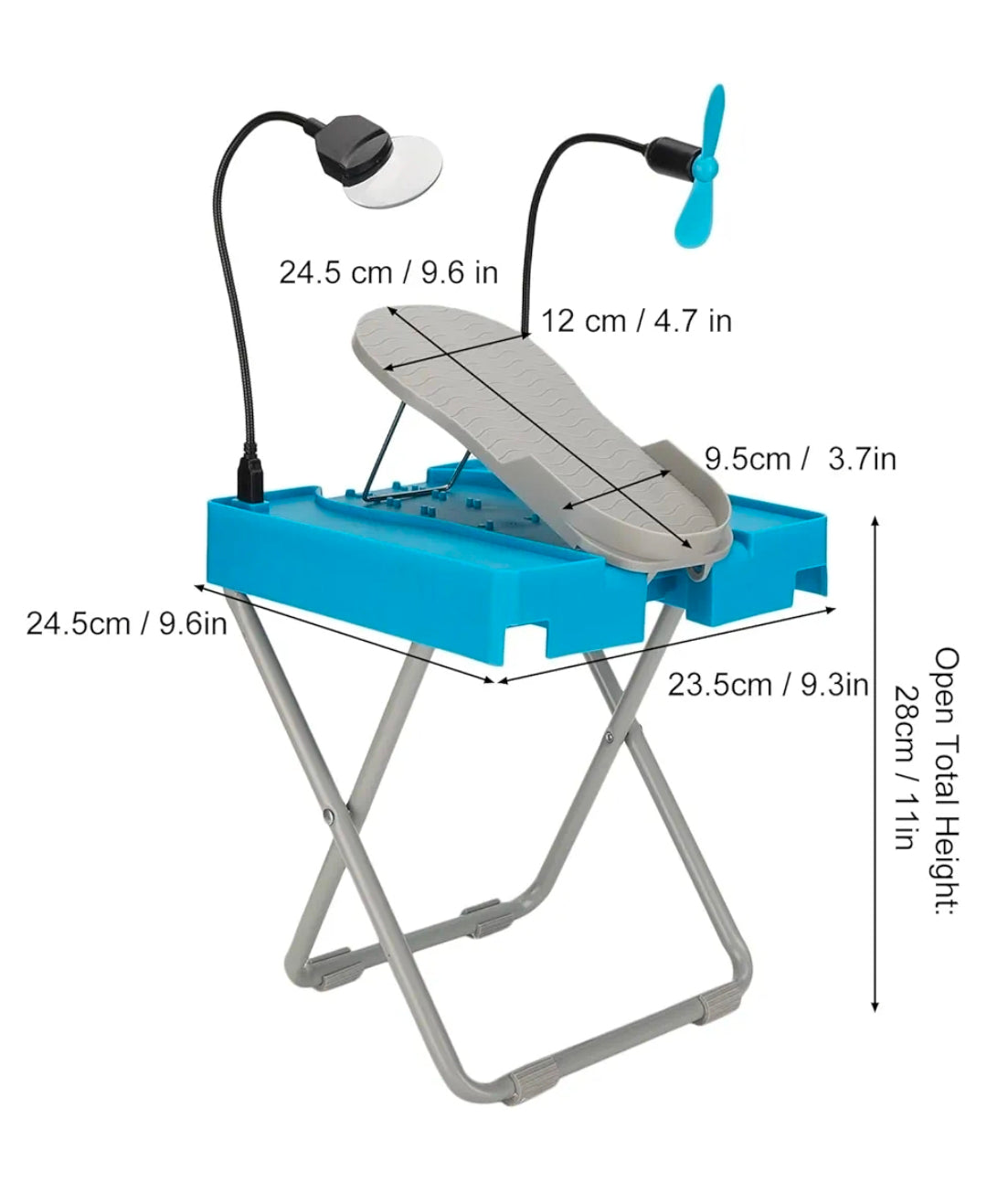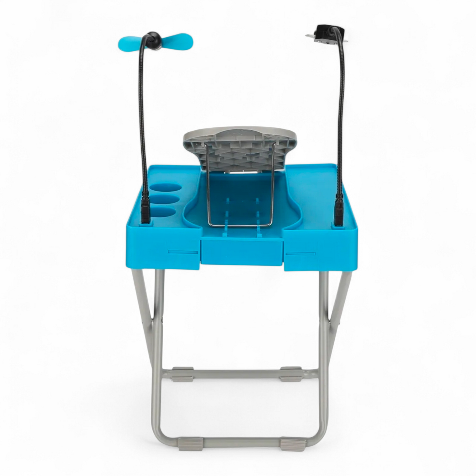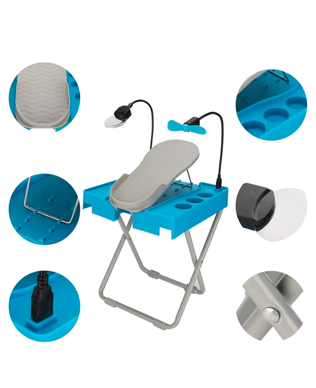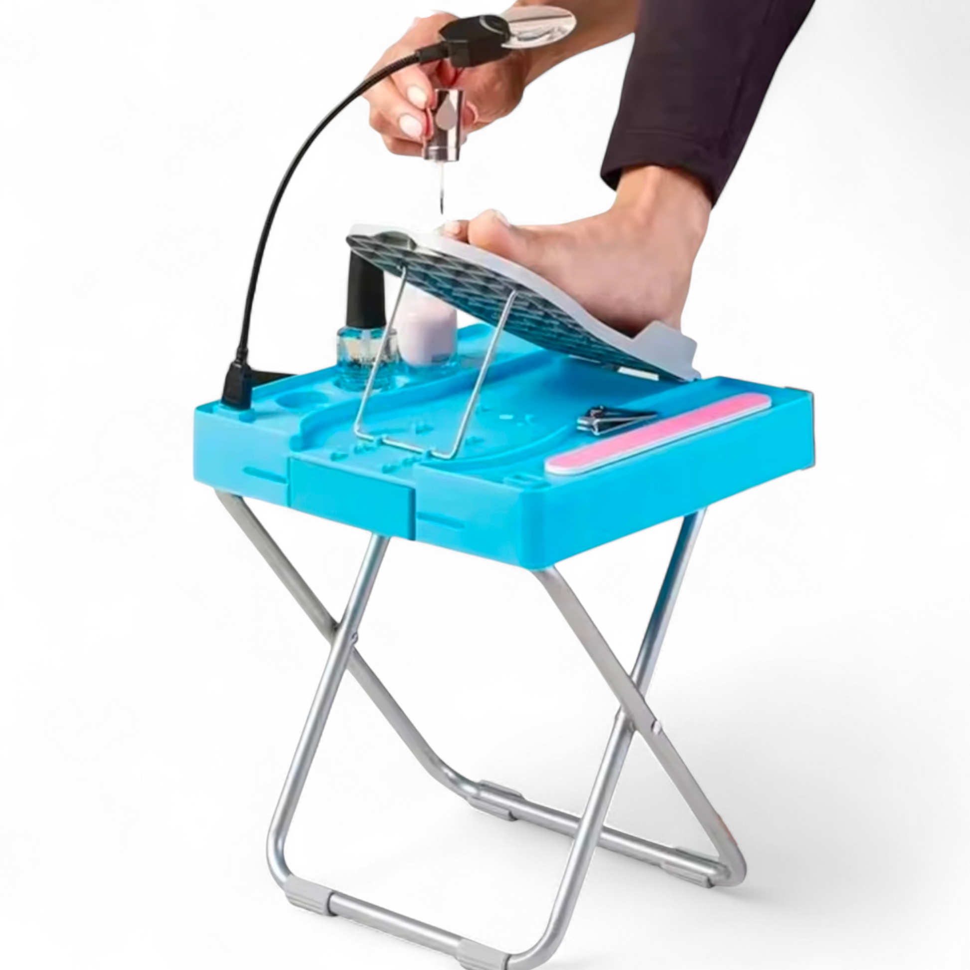 Fótsnyrtistandur sem sameinar allt sem þú þarft í einum pakka. Stillanlegan stand sem heldur fætinum stöðugum, þægilegt vinnusvæði með hólfum fyrir naglalökk og annarskonar tól og innbyggða skúffu sem geymir allt smádótið. Standurinn kemur með lítilli viftu til að þurrka naglalakkið jafnóðum og stækkunargleri sem hjálpar þér að sinna smáatriðunum vel.