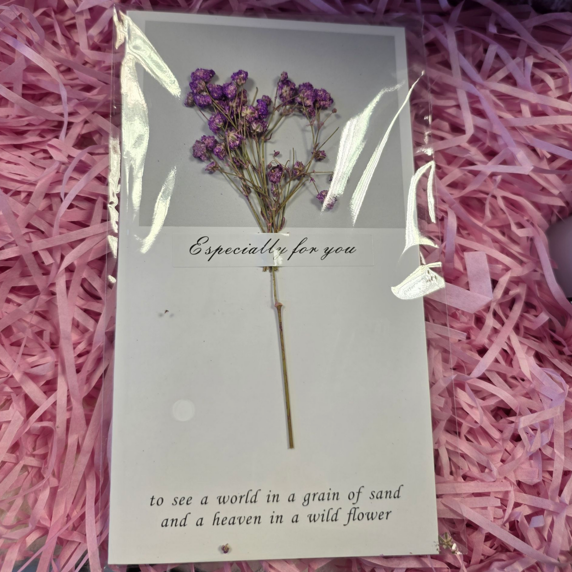 - Persónulegt gjafakort með þurrkuðu blómi að framanverðu