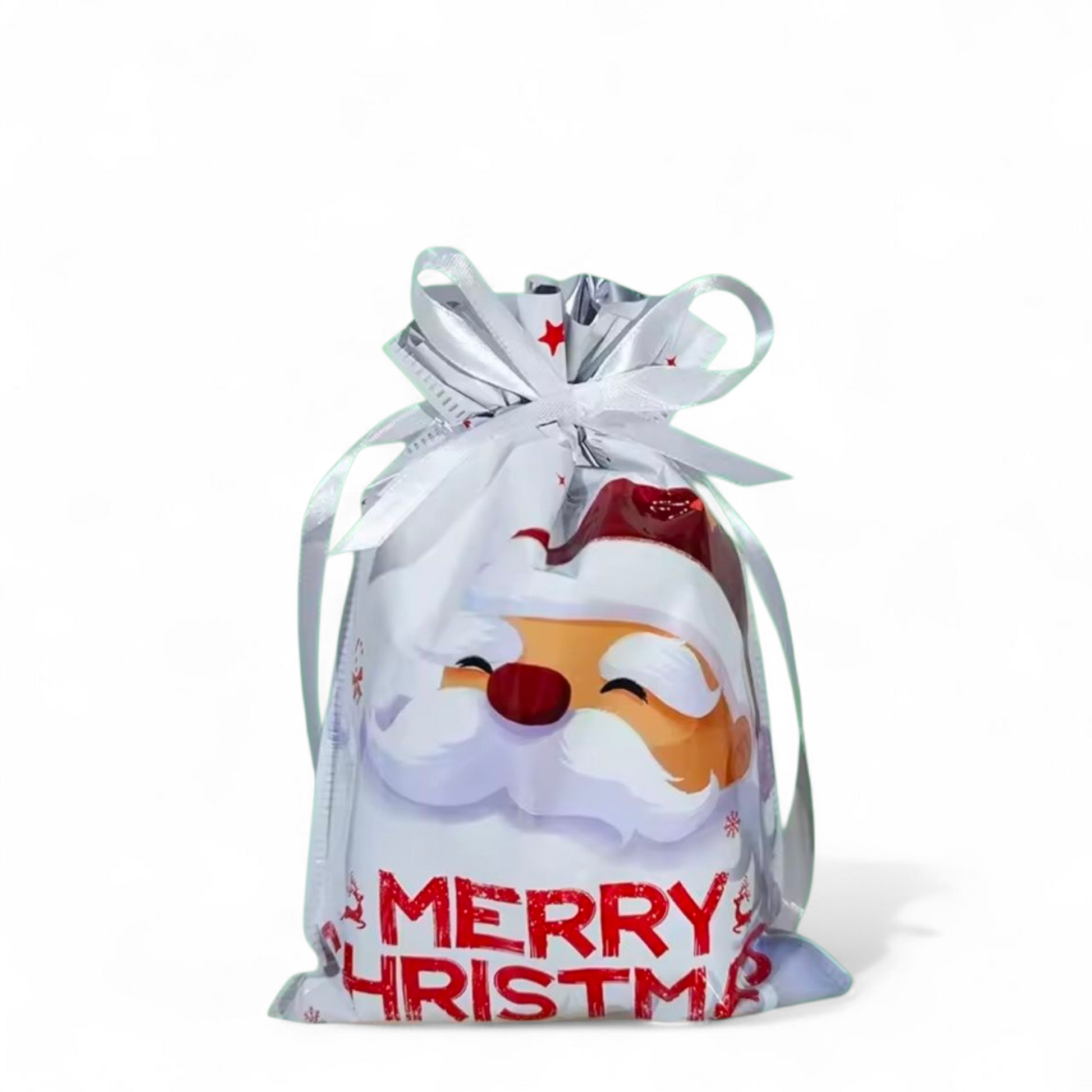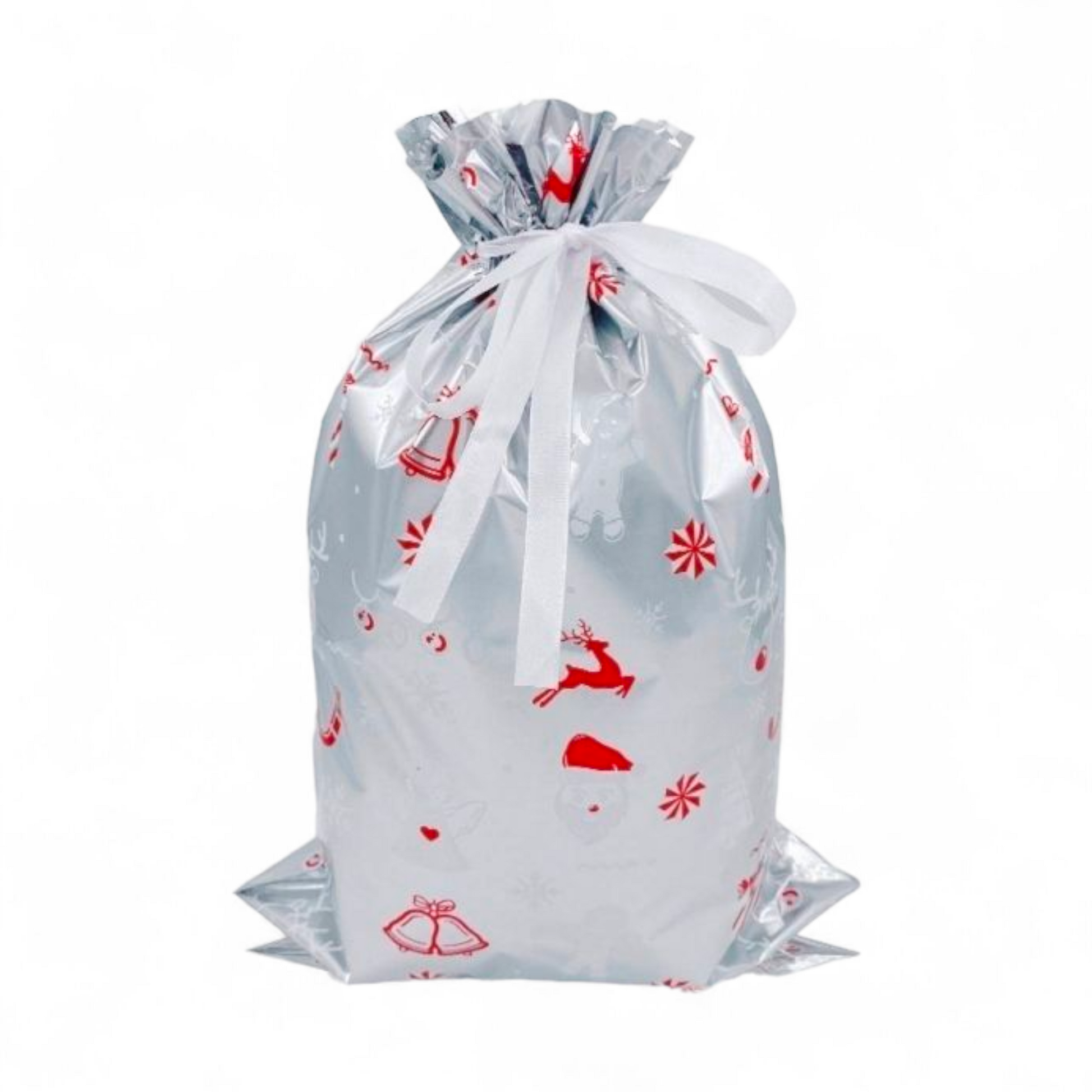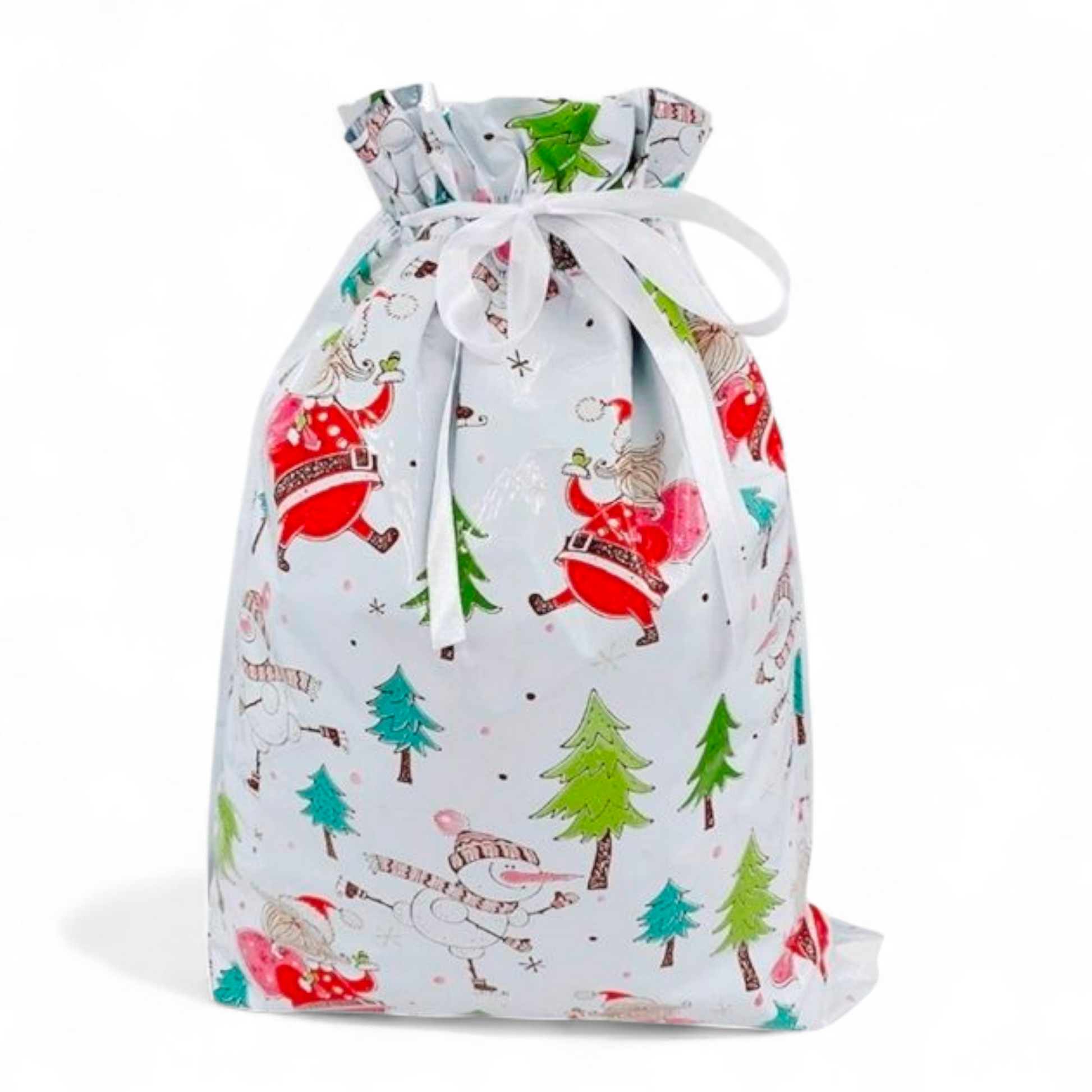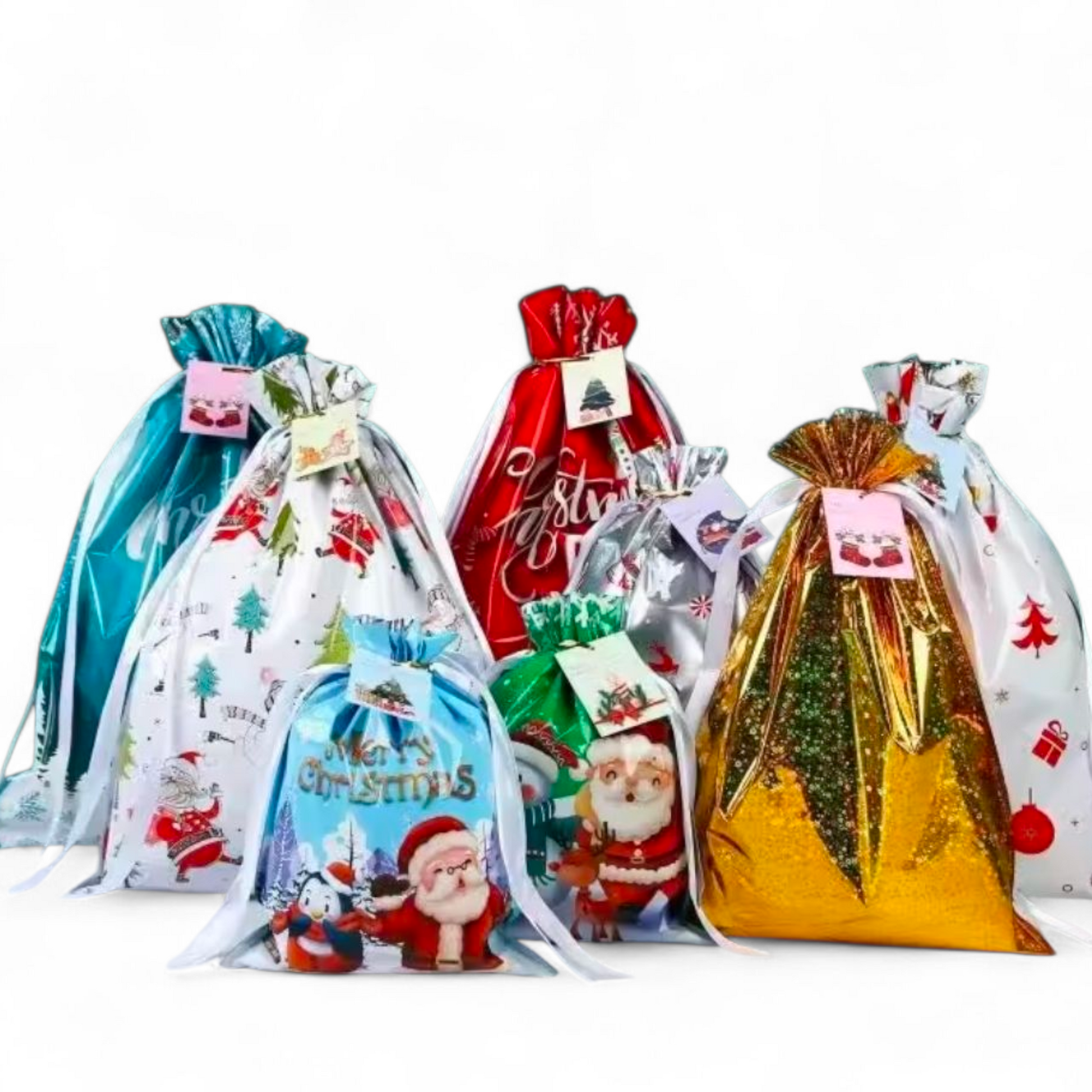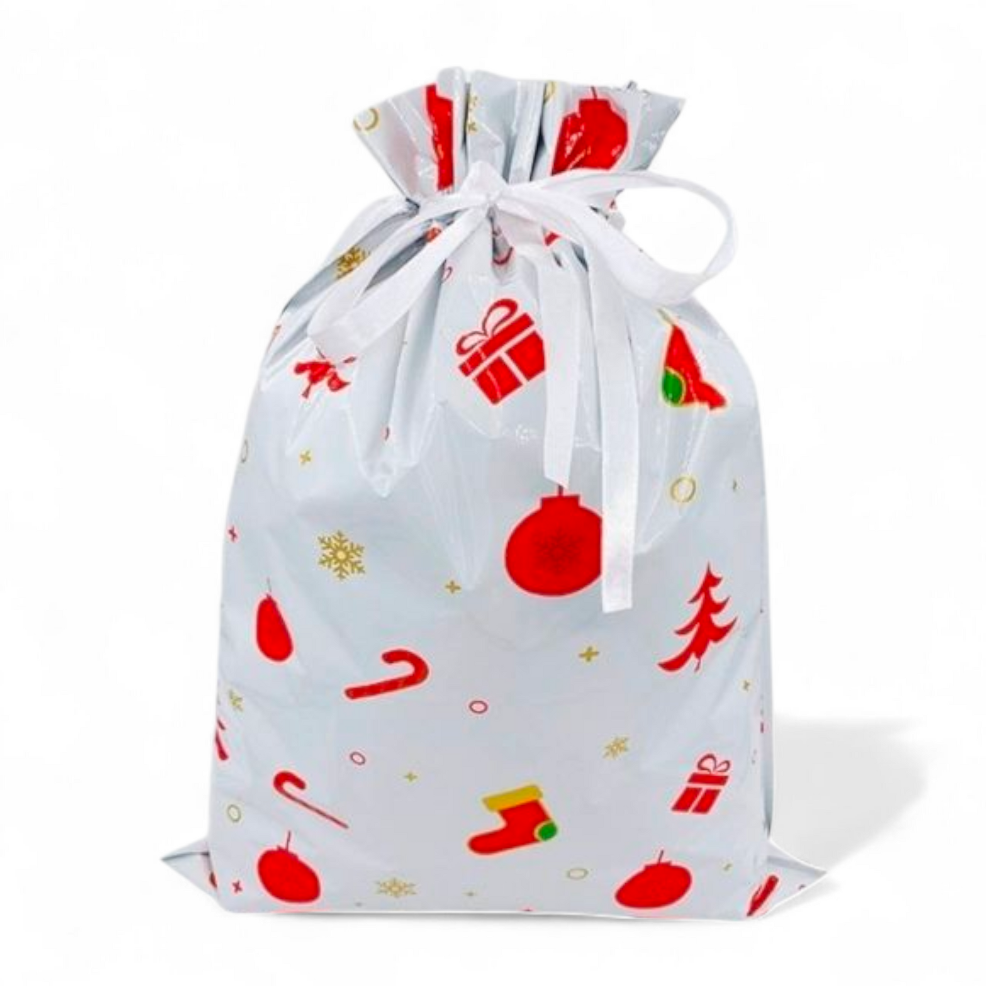 Sterkir og glansandi gjafapappírs pokar með innþræddum borða sem lokar pokunum tryggilega með einu handtaki þannig að þeir líti út eins og innpökkuð jólagjöf.