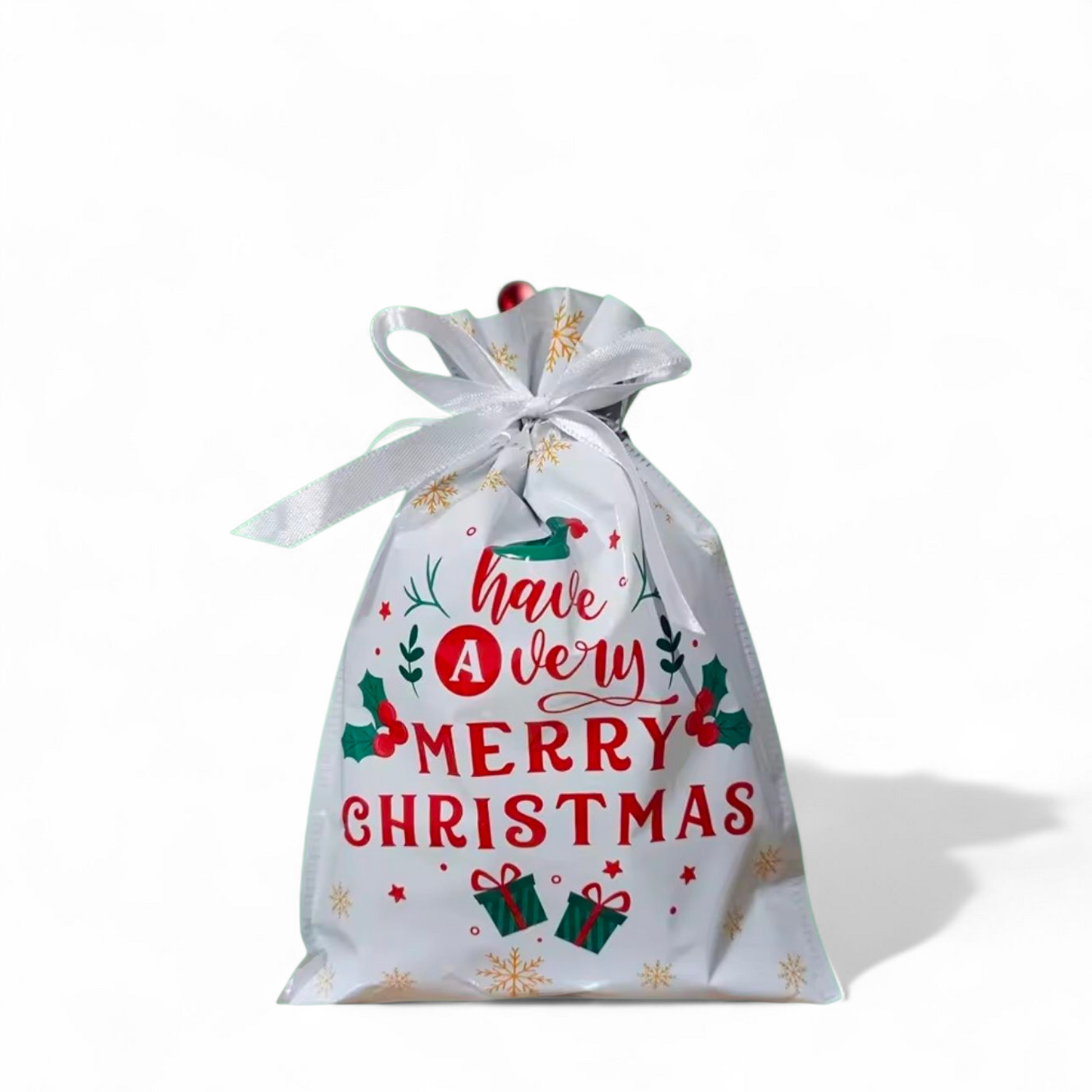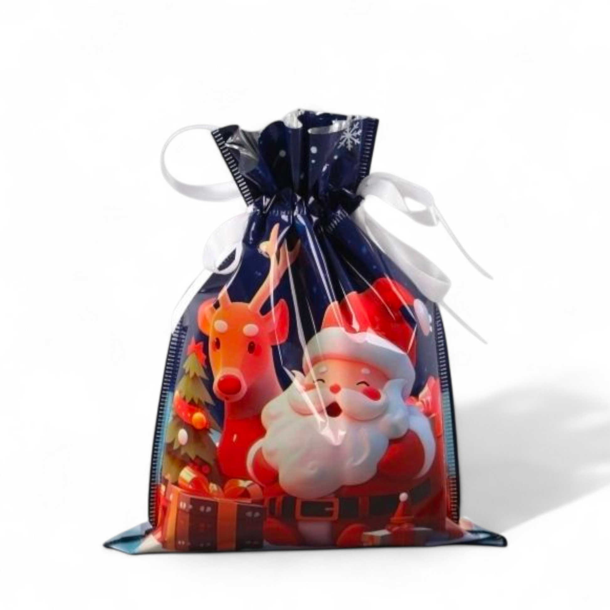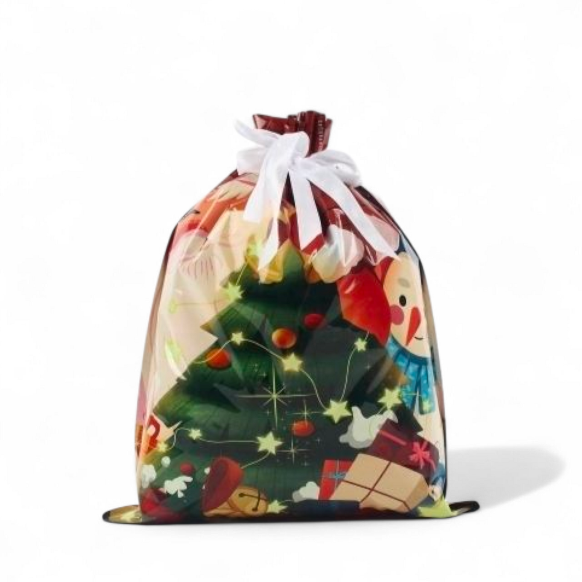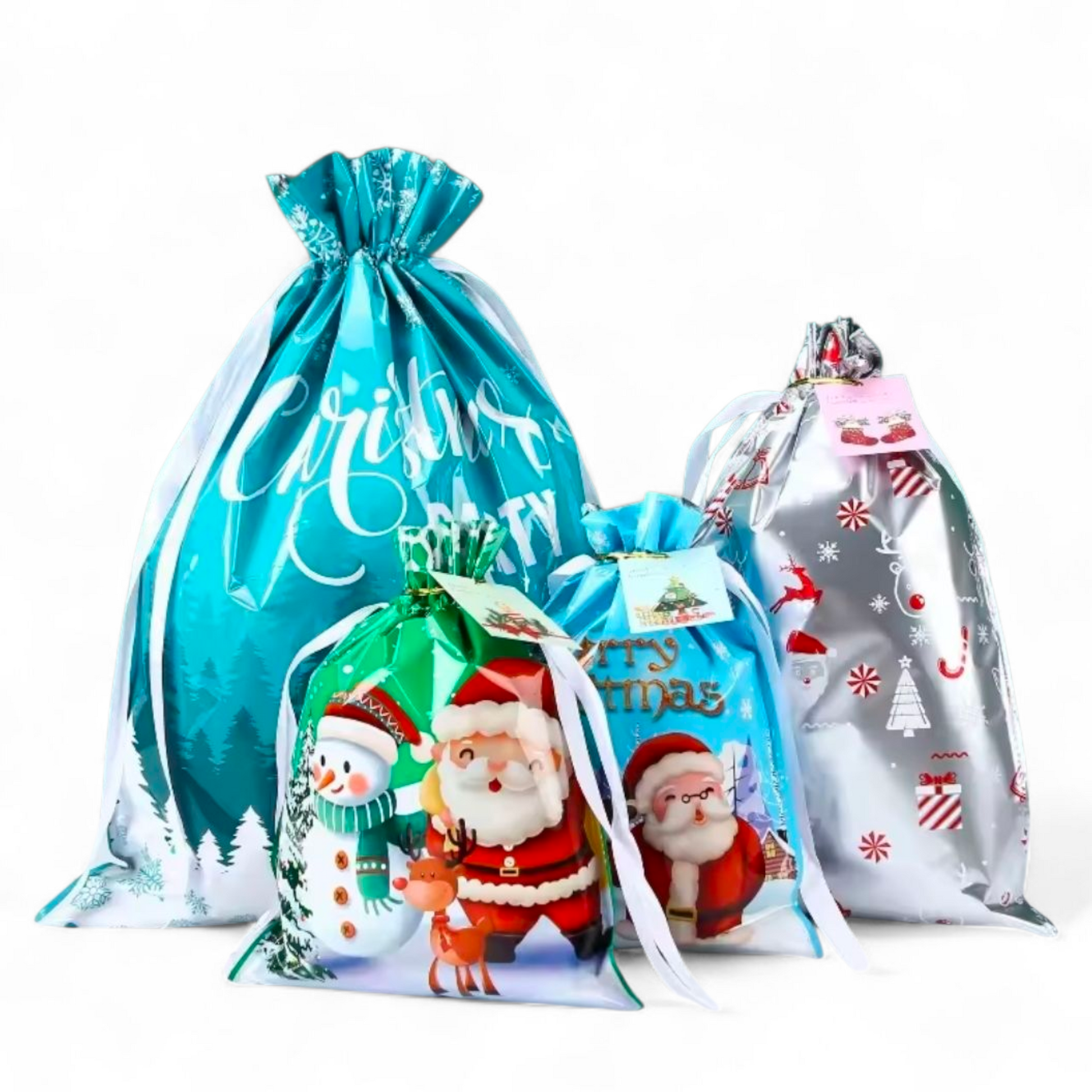 Sterkir og glansandi gjafapappírs pokar með innþræddum borða sem lokar pokunum tryggilega með einu handtaki þannig að þeir líti út eins og innpökkuð jólagjöf.