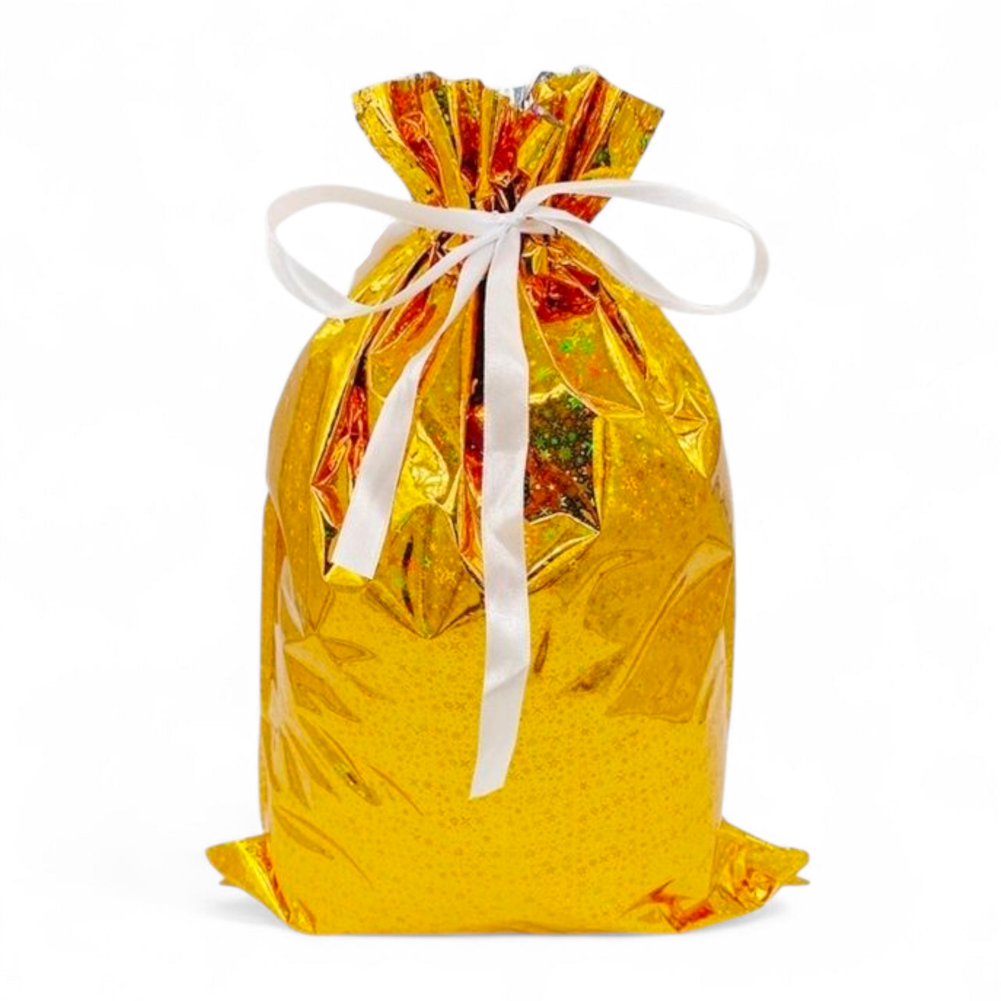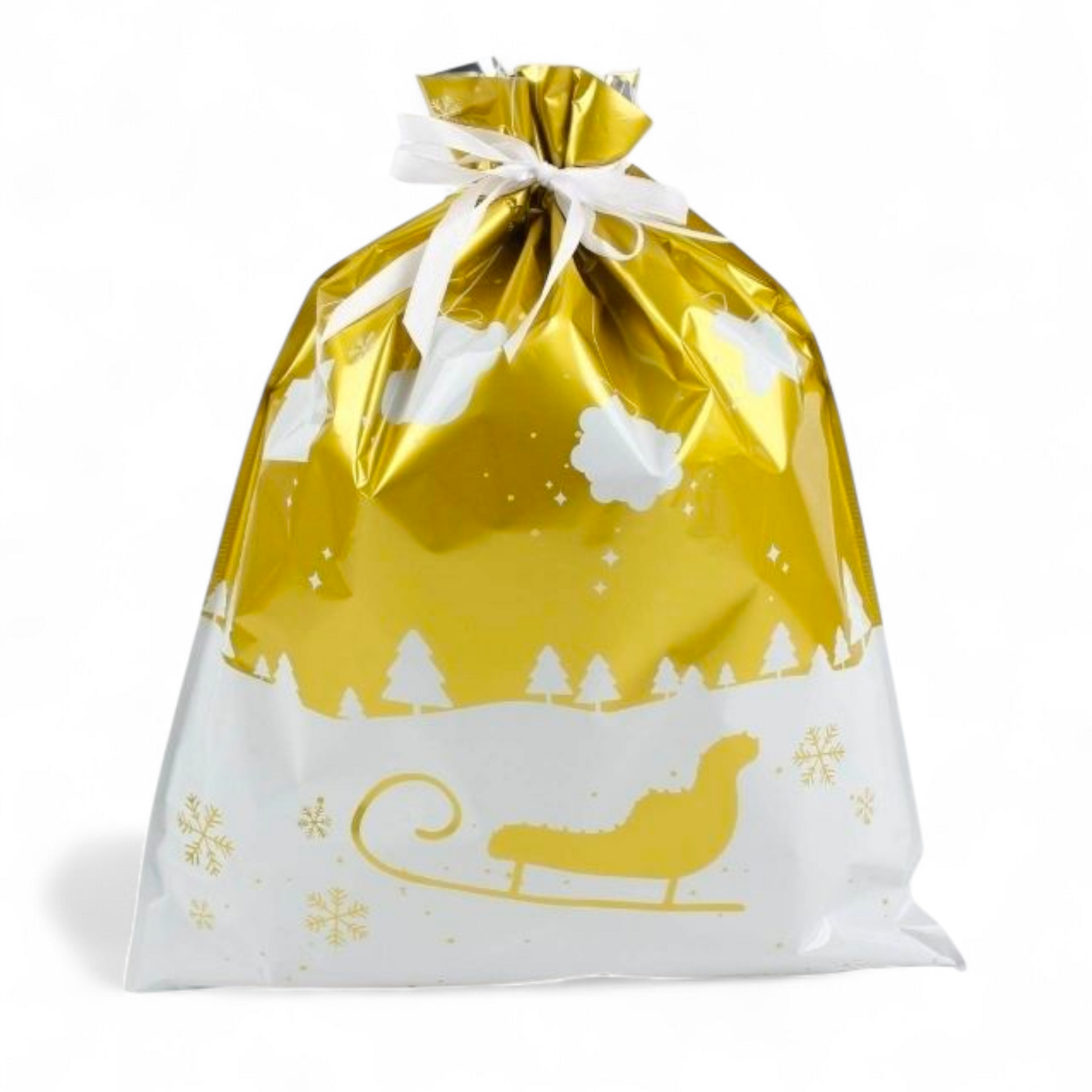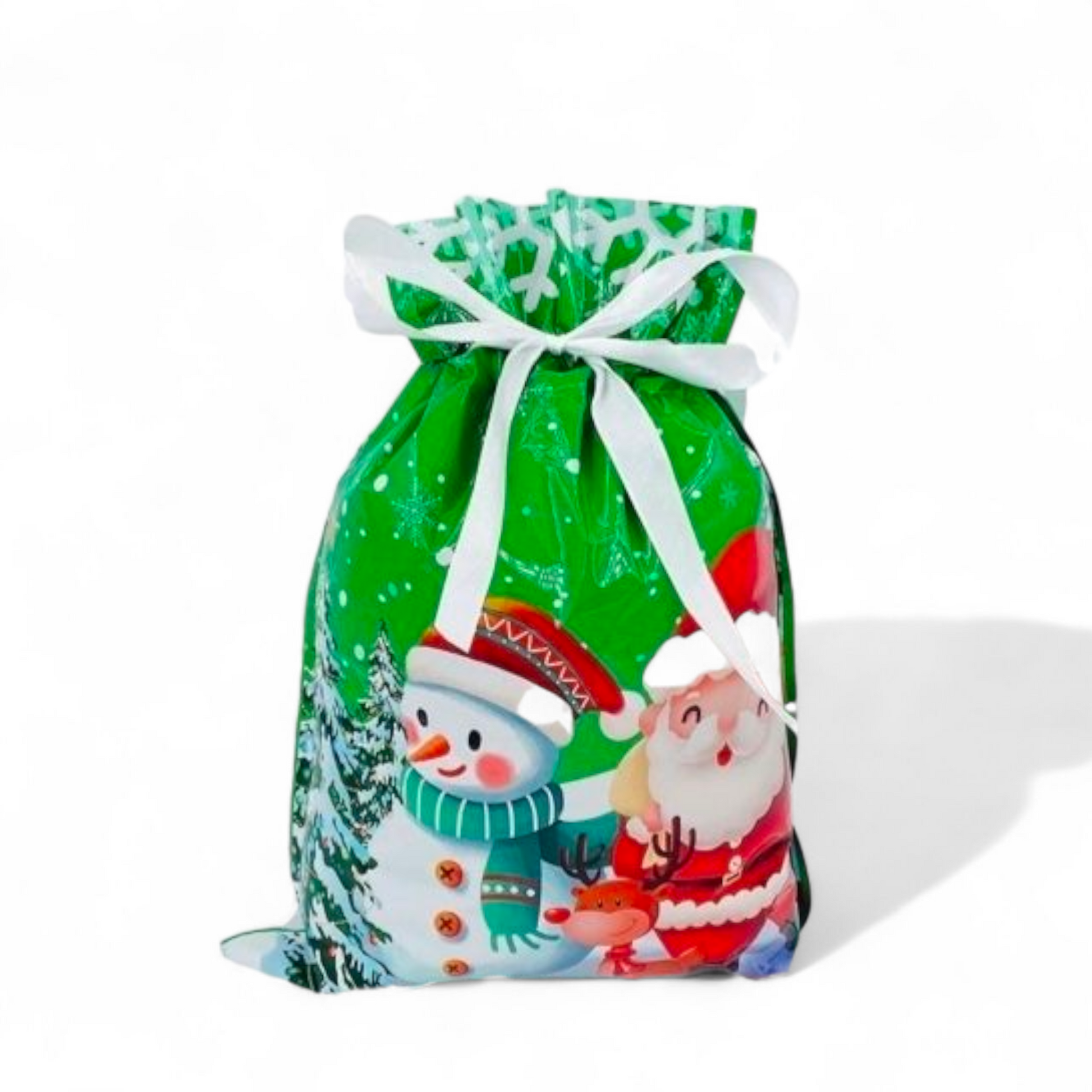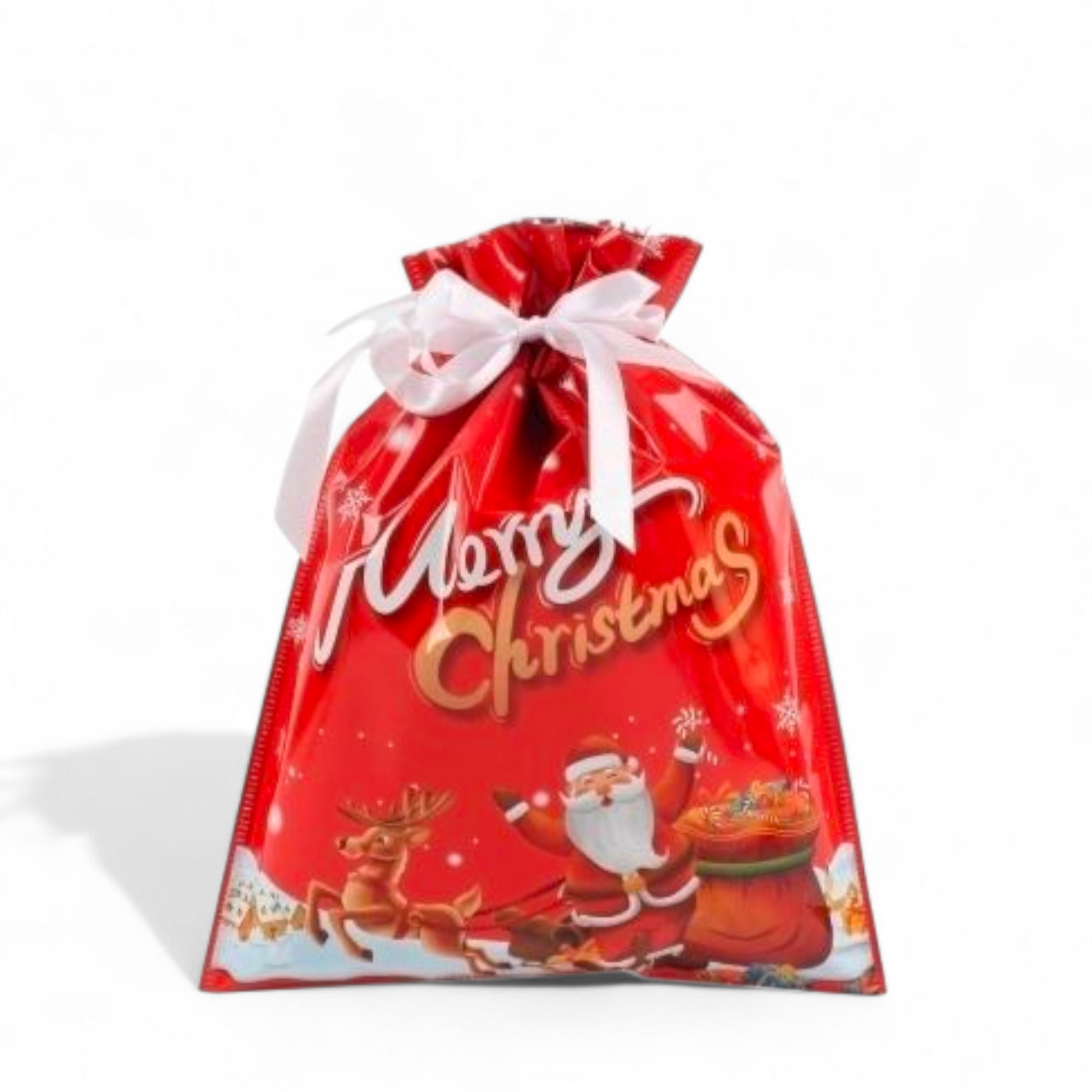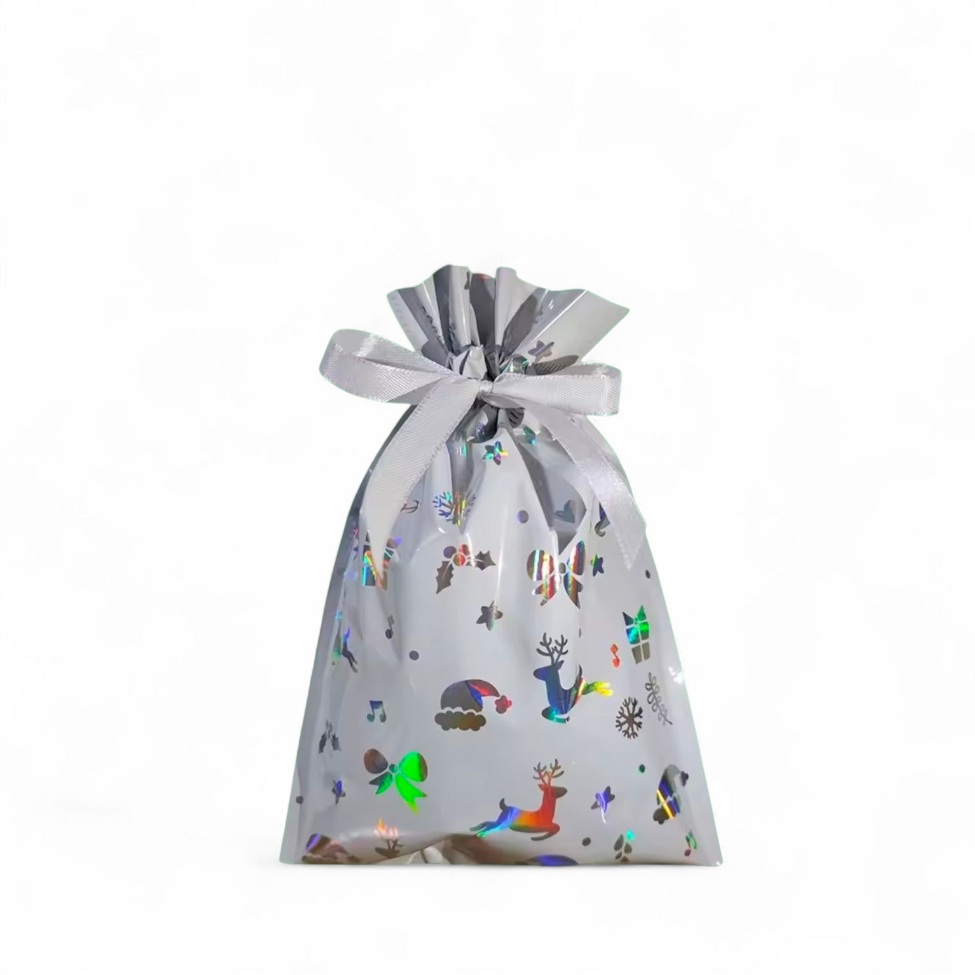 Sterkir og glansandi gjafapappírs pokar með innþræddum borða sem lokar pokunum tryggilega með einu handtaki þannig að þeir líti út eins og innpökkuð jólagjöf.