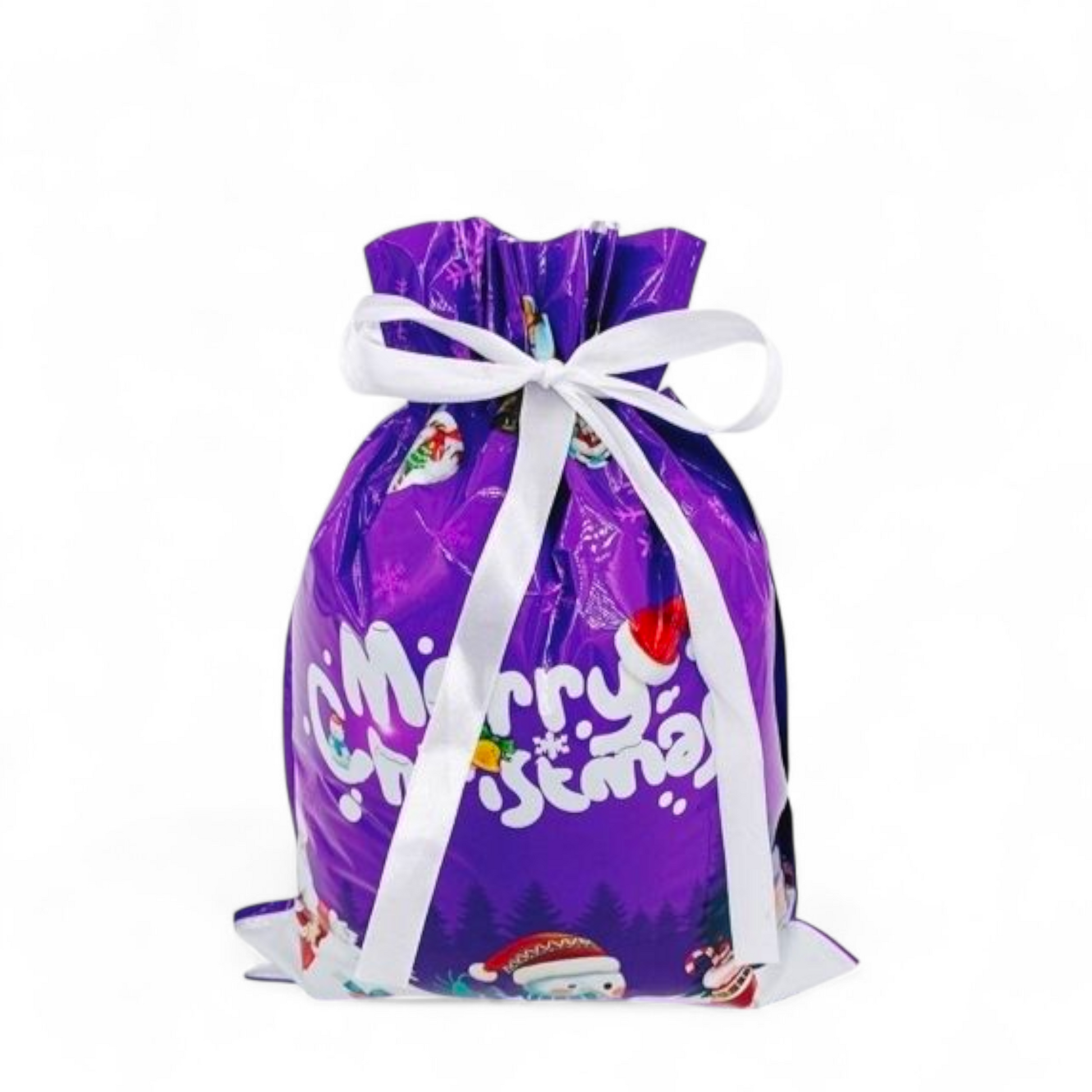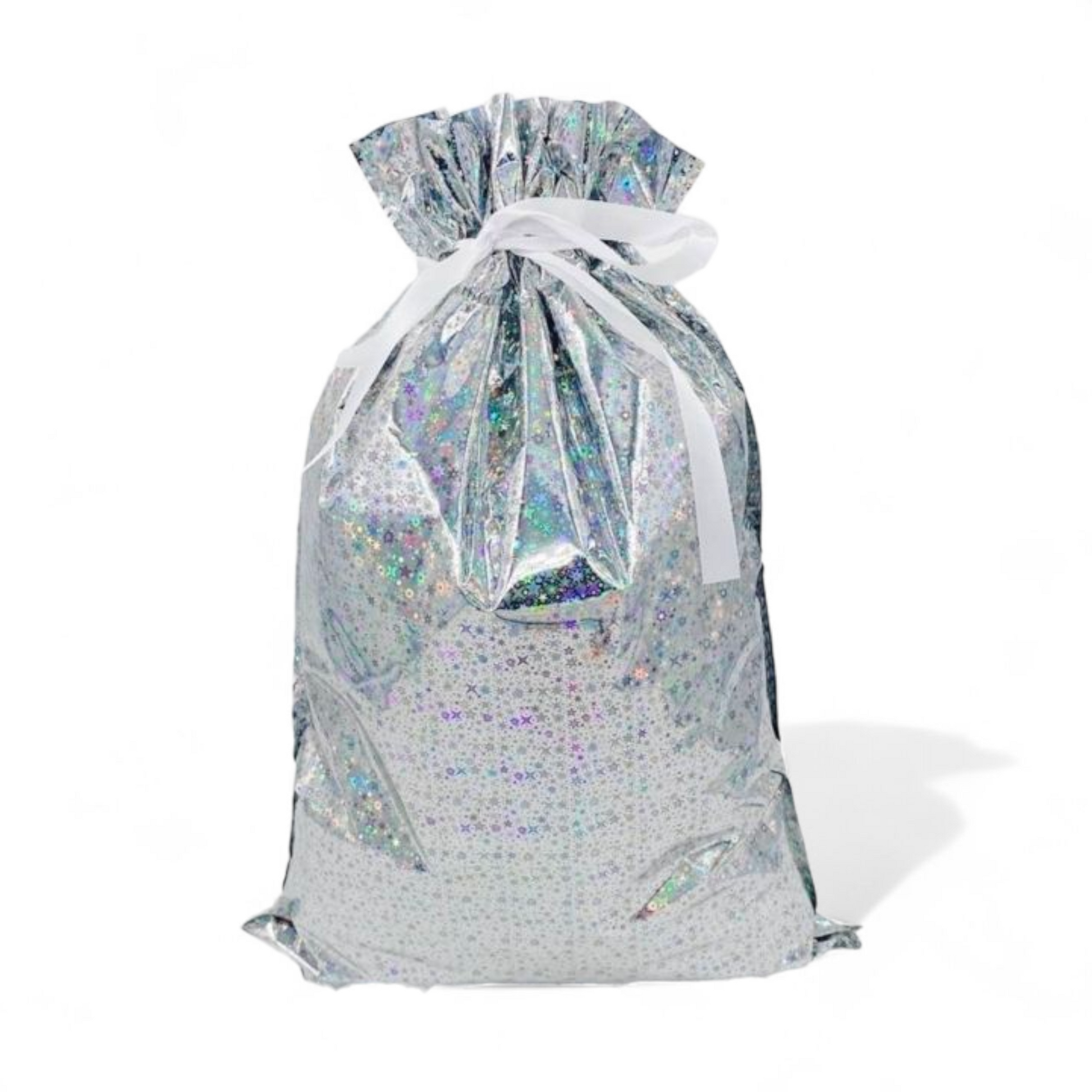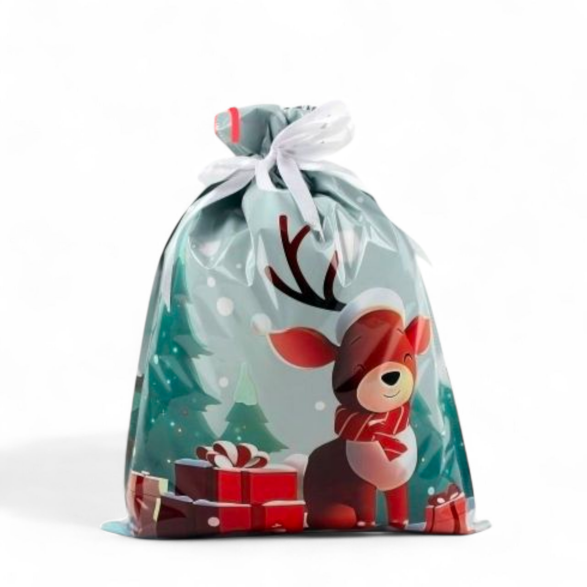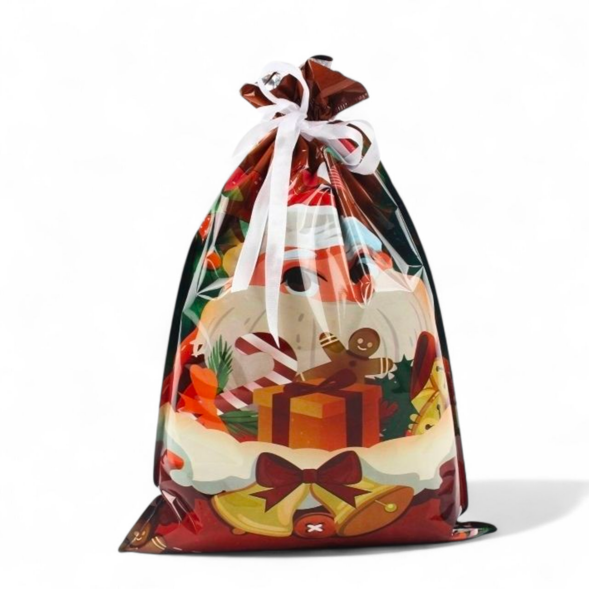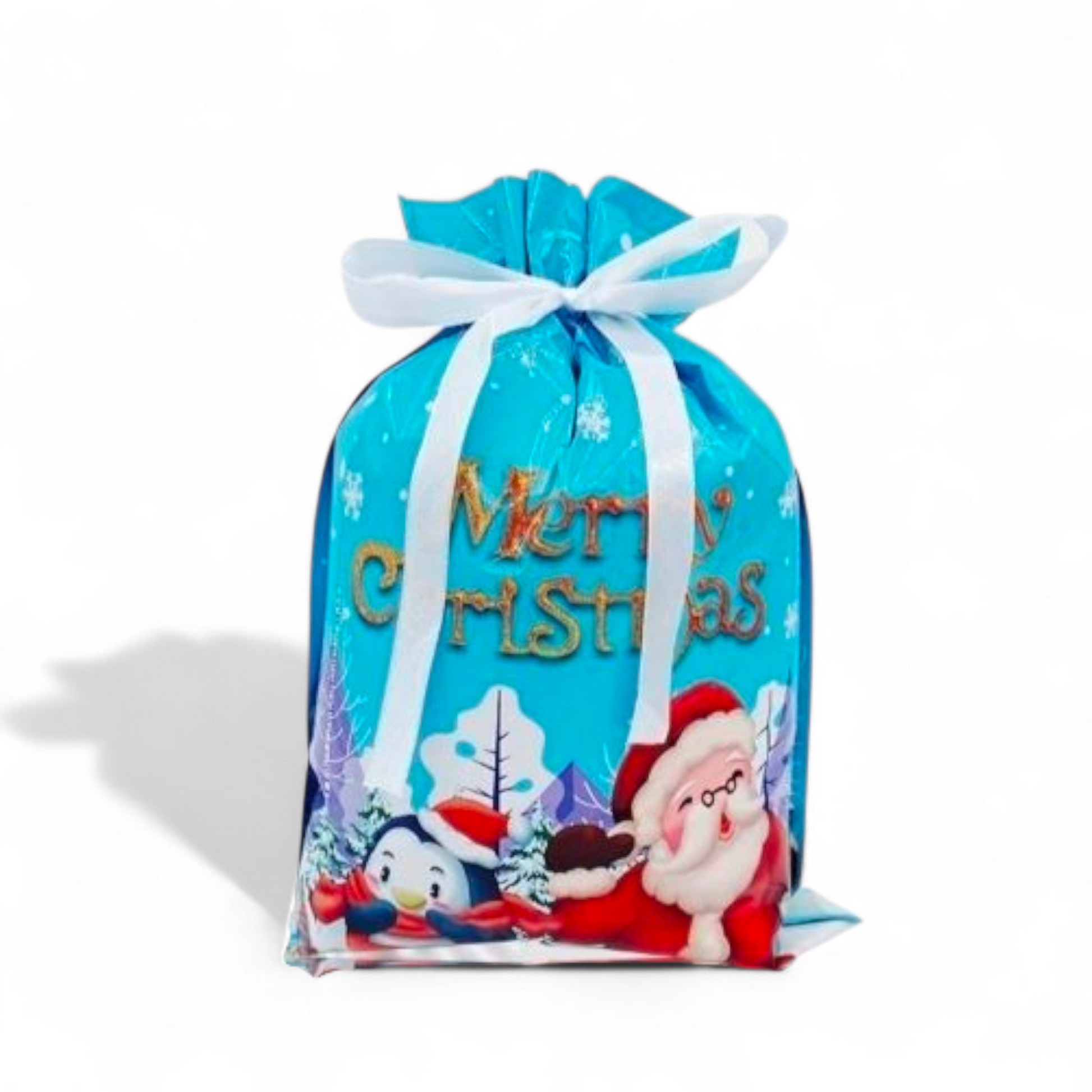 Sterkir og glansandi gjafapappírs pokar með innþræddum borða sem lokar pokunum tryggilega með einu handtaki þannig að þeir líti út eins og innpökkuð jólagjöf.