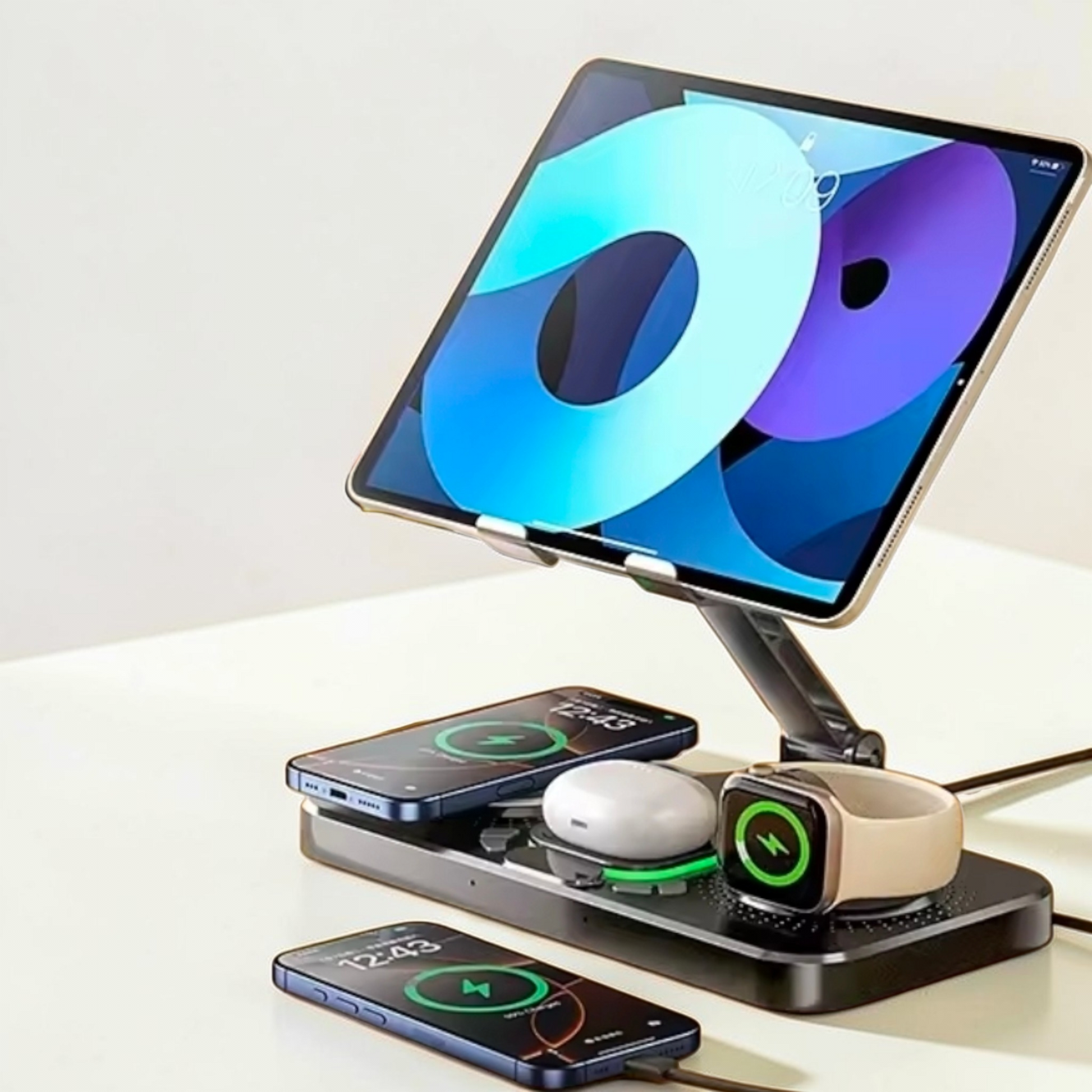 Hágæða hleðslustöð sem er hönnuð fyrir fagurkerann. Hún samanstendur af símastand með 360 gráðu snúningsdisk, innbyggðri klukku, LED lýsingu og svo að sjálfsögðu þrefaldri hleðslu sem er hönnuð fyrir farsíma, snjallúr og heyrnartól.