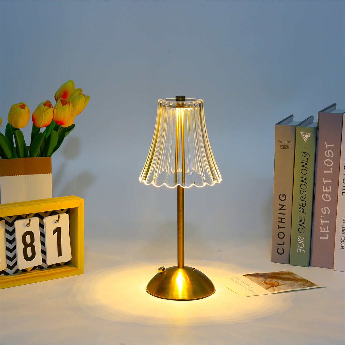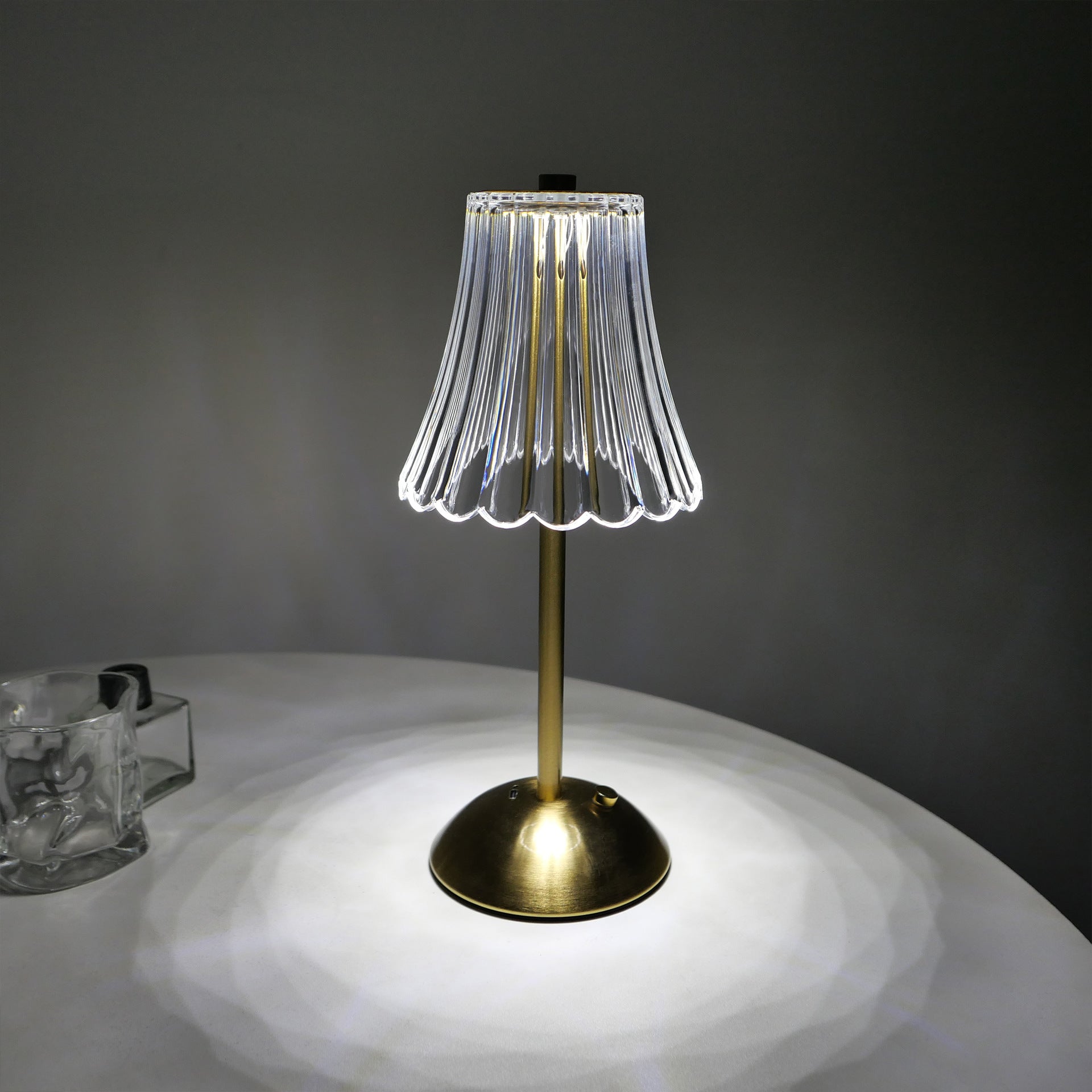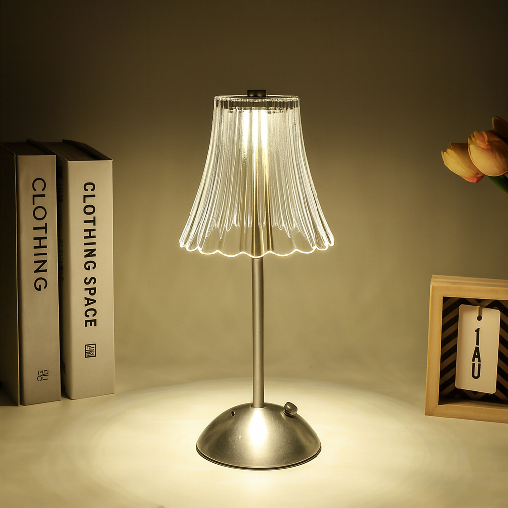 Einstaklega fallega hannaður LED lampi sem kemur með sérsniðnu batteríi að okkar ósk sem lifir í allt að 15 klst. Lampinn er unnin úr stál umgjörð á meðan toppstykkið er unnið úr kristaltærum akrýl. Hann bíður uppá þrennskonar birtu valmöguleika sem samanstendur af Warm light, White light og Natural light sem er hægt að stilla eftir stemmningu og notalegheitum hverju sinni með einfaldri snertistjórnun.