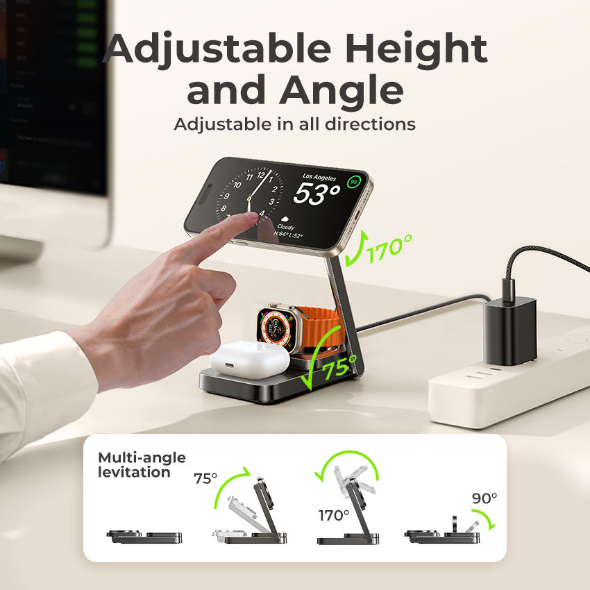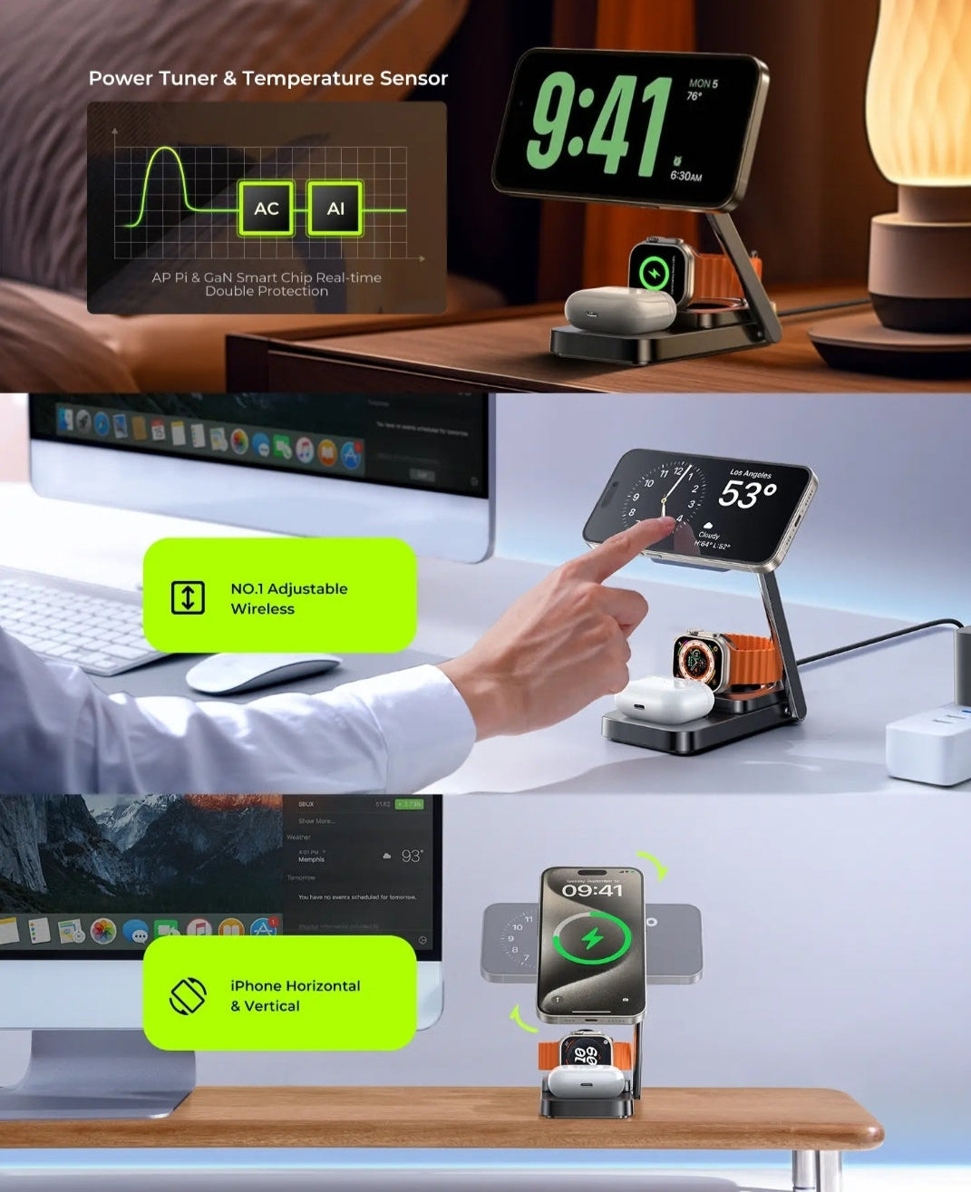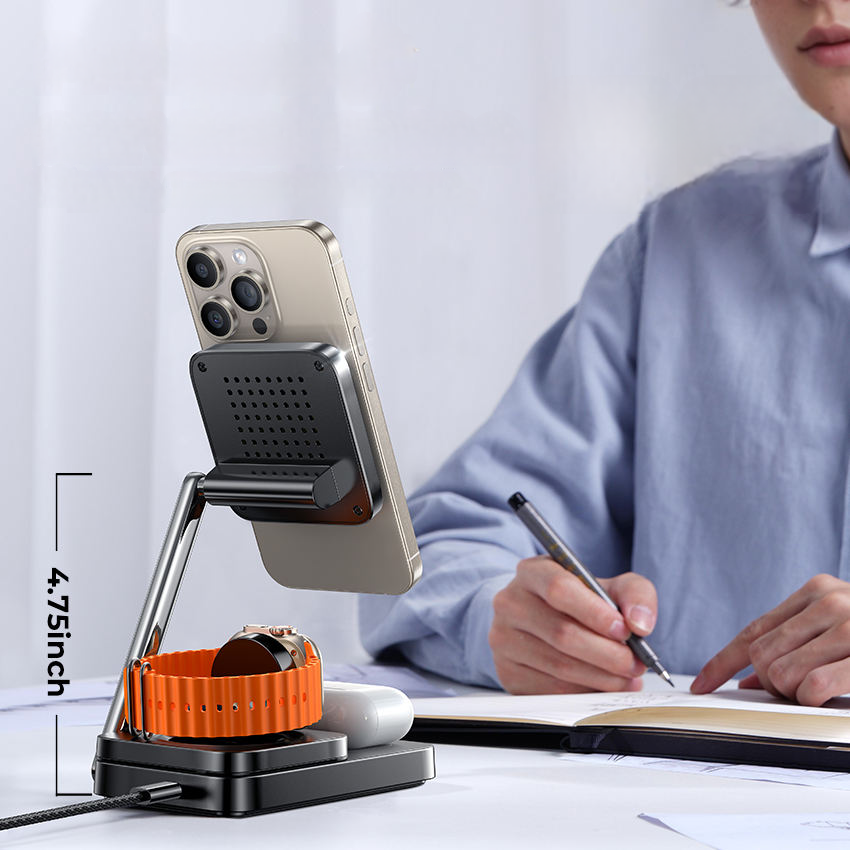 Hágæða hleðslustöð frá Lisen sem er einnig hentug í ferðalög. Hún bíður uppá hraðhleðslu fyrir allar gerðir farsíma, Apple snjallúr og Airpods. Stöðin er sterkbyggð með innbyggðri MagSafe segulhleðslu og samanbrjótanleg til að ferðast auðveldlega með á milli staða.
