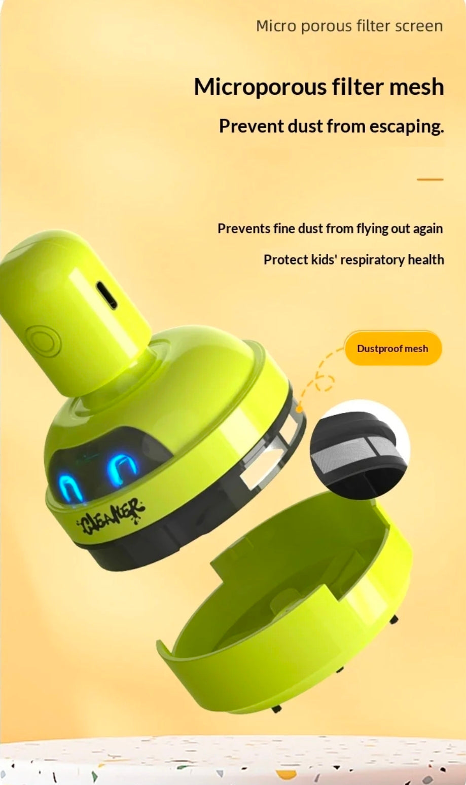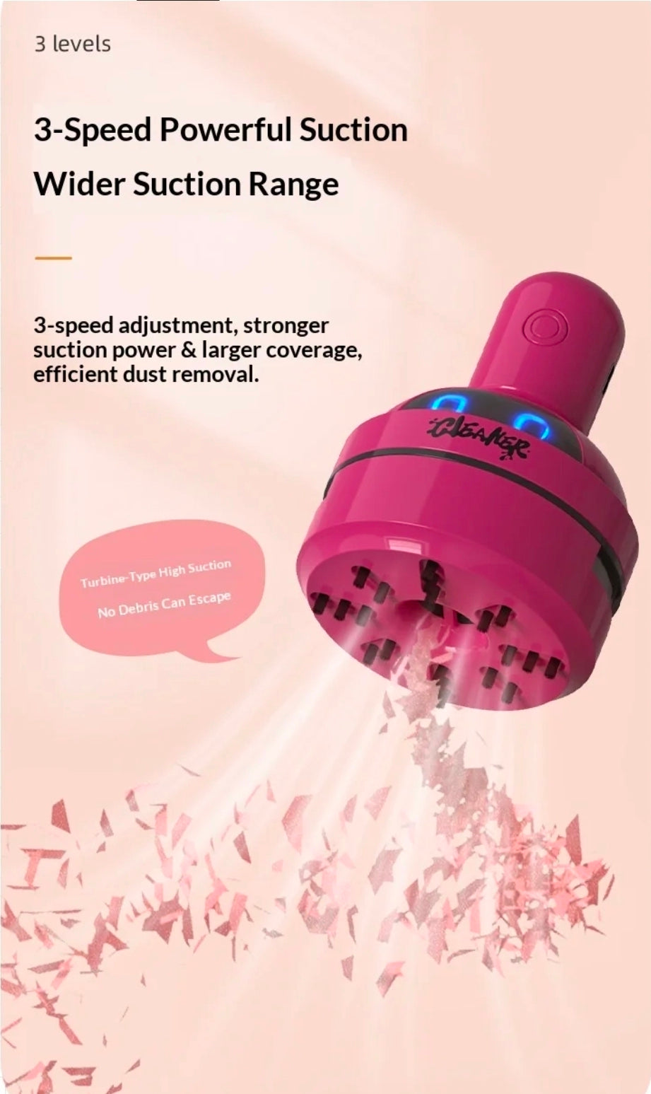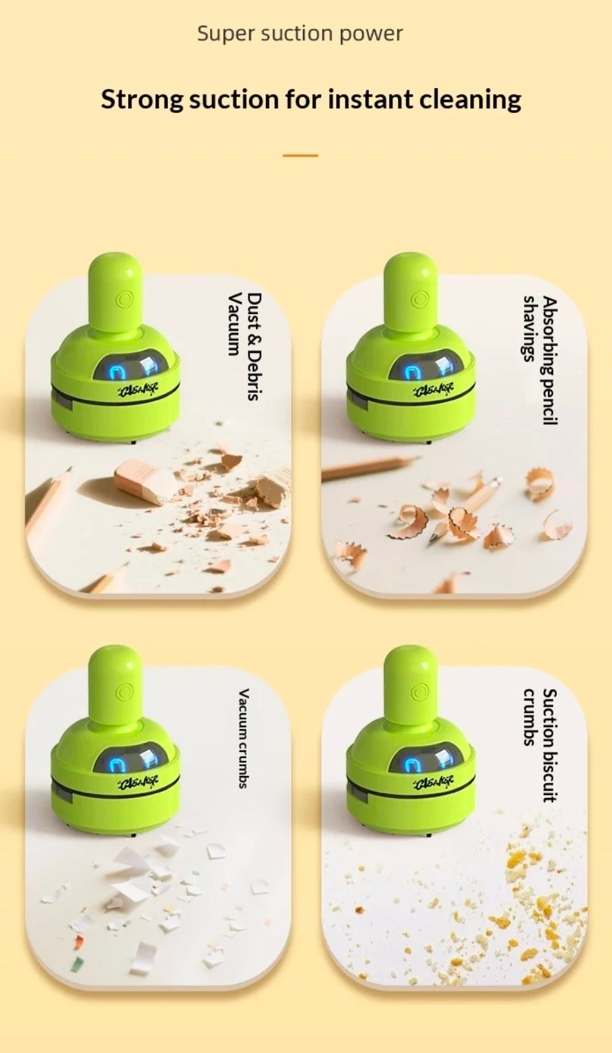 Mini skrifborðsryksuga sem er hönnuð fyrir þá sem vilja halda vinnusvæðinu hreinu án fyrirhafnar. Hún er þráðlaus, lítil og nett í hendi en skilar engu að síður öflugum afköstum miðað við stærð. Með stillanlegum sogkrafti ræður hún jafnt við fínt ryk sem smámola, blýantsafskurð og annað daglegt rusl sem safnast upp á skrifborði, bókum eða lyklaborði.