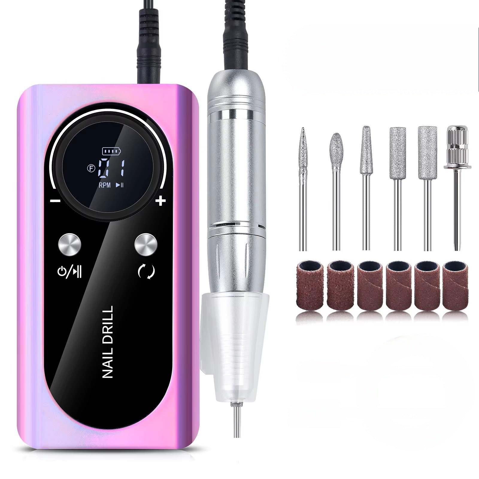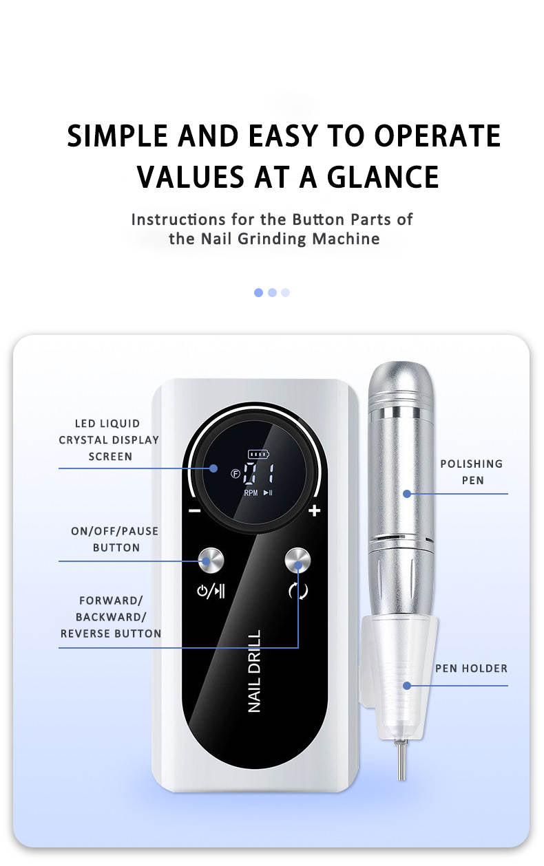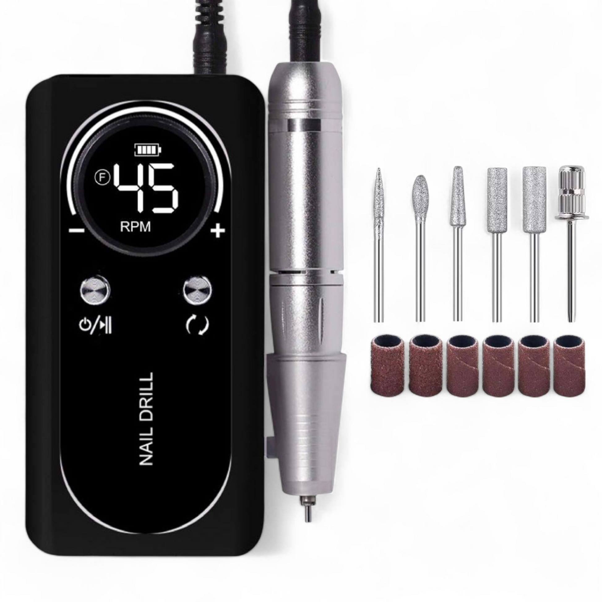 Naglabor/slípivél sem nær allt að 45.000 snúningum á mínútu og hentar bæði fagfólki og heimilisnotkun. Tækið kemur með LCD skjá sem sýnir hraða og rafhlöðustöðu, stillanlegan snúningshraða og möguleikann á að snúa í báðar áttir. Með fjölbreyttum slípihausum er auðvelt að móta, slípa og pússa bæði náttúrulega neglur sem og gervineglur, fjarlægja lakk, dauða húð o.fl. Græja í gæðaflokki sem getur þjónustað öll svið þegar kemur að vinnslu á nöglum.