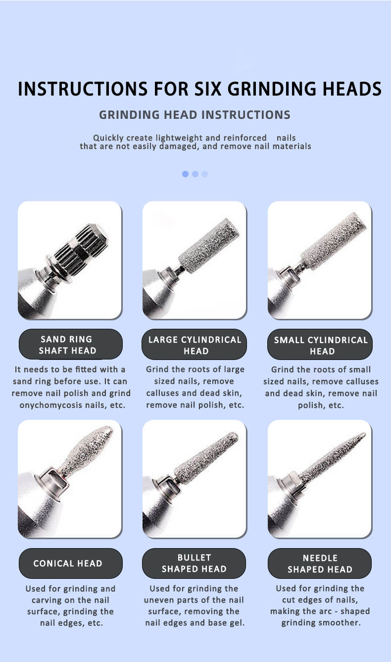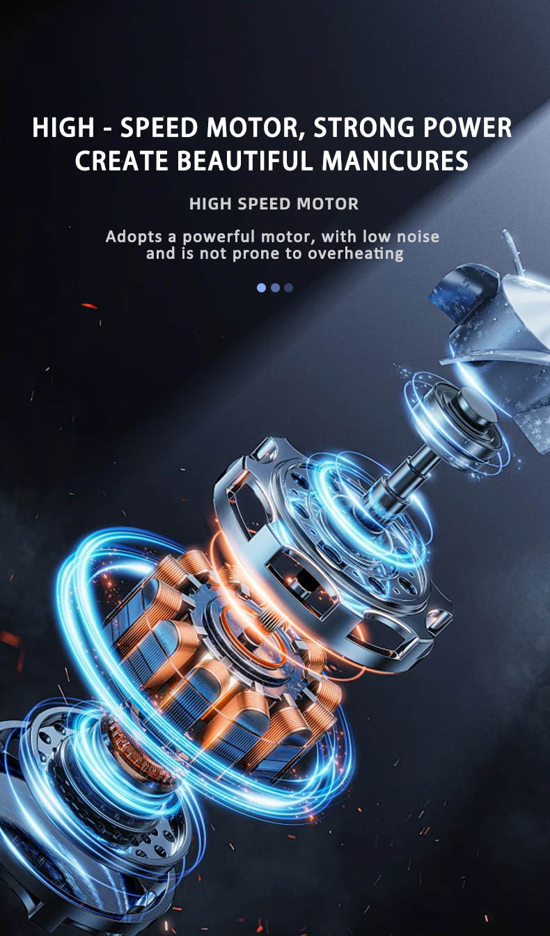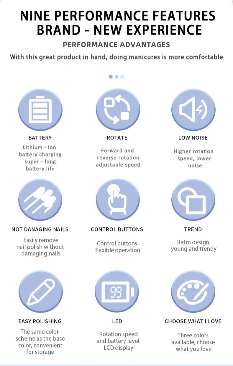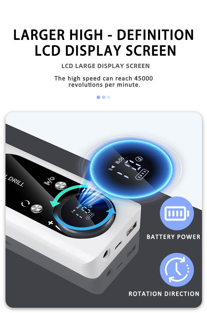 Naglabor/slípivél sem nær allt að 45.000 snúningum á mínútu og hentar bæði fagfólki og heimilisnotkun. Tækið kemur með LCD skjá sem sýnir hraða og rafhlöðustöðu, stillanlegan snúningshraða og möguleikann á að snúa í báðar áttir. Með fjölbreyttum slípihausum er auðvelt að móta, slípa og pússa bæði náttúrulega neglur sem og gervineglur, fjarlægja lakk, dauða húð o.fl. Græja í gæðaflokki sem getur þjónustað öll svið þegar kemur að vinnslu á nöglum.