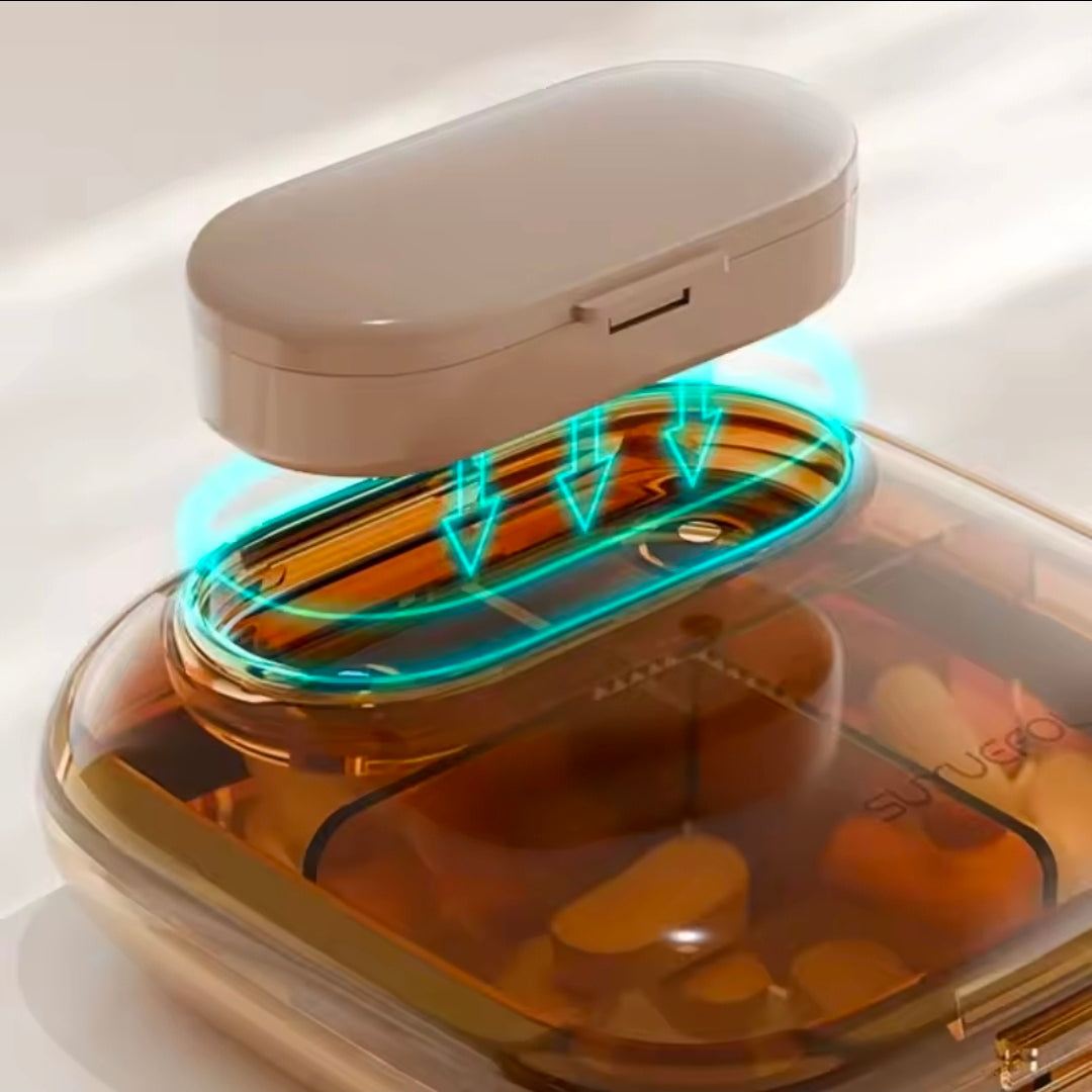 Stílhreint og hagnýtt lyfjabox sem heldur öllu í röð og reglu. Hólfin eru sjö talsins, hvert með sinni plasthurð sem heldur innihaldinu þurru og öruggu. Boxið er bæði loftþétt og vatnshelt með traustri umgjörð sem þolir daglega notkun. Aftan á því er lítið segulbox sem má losa eftir þörf og taka með sér á ferðina.