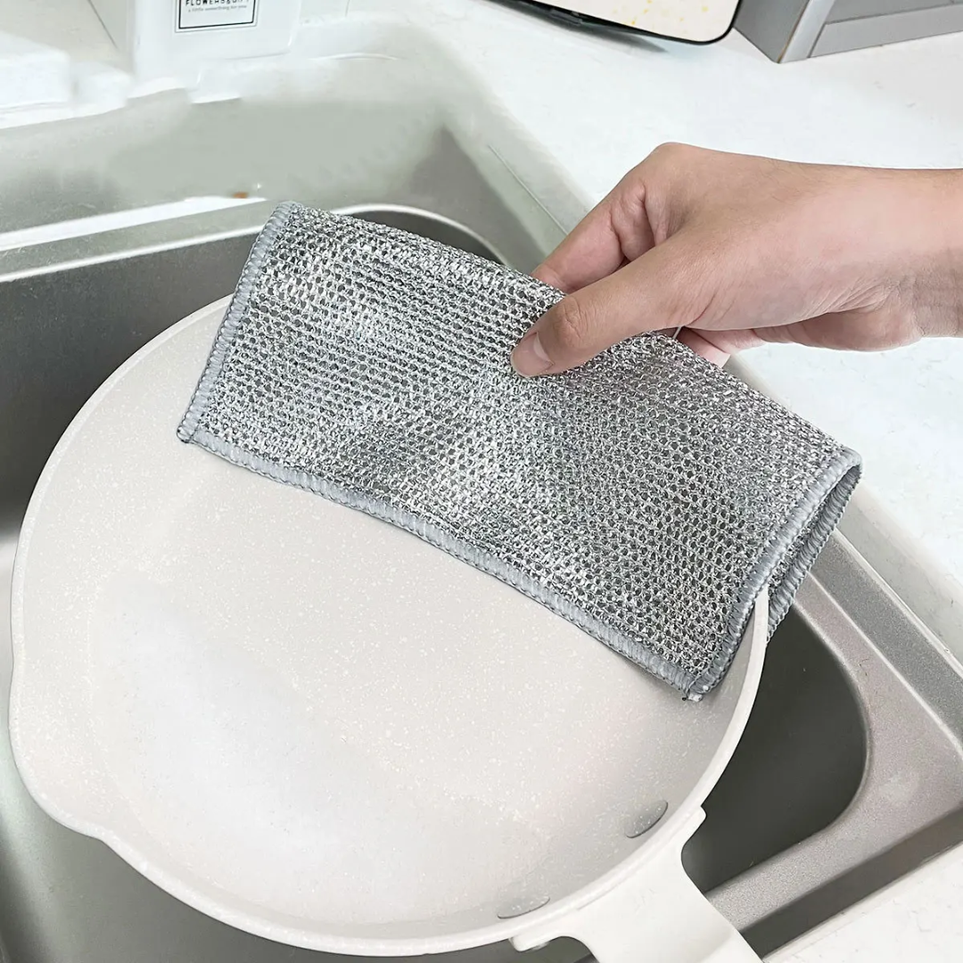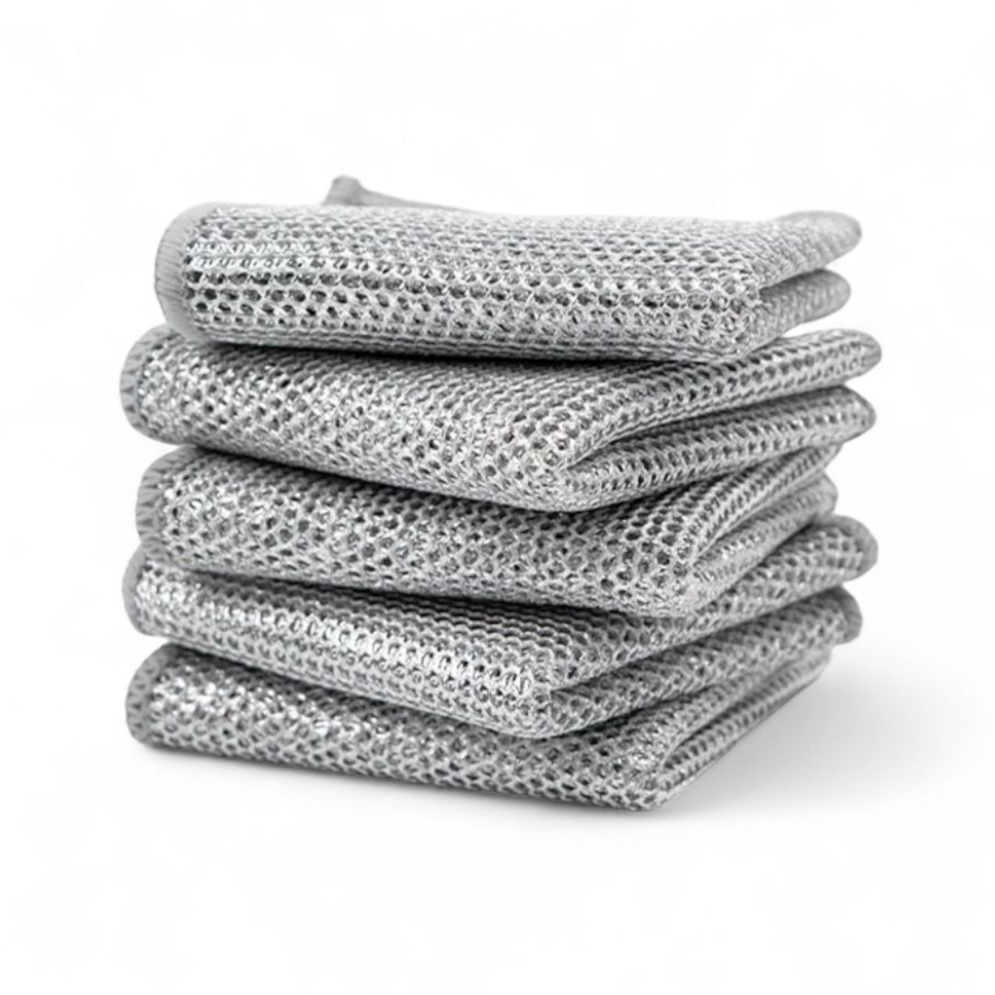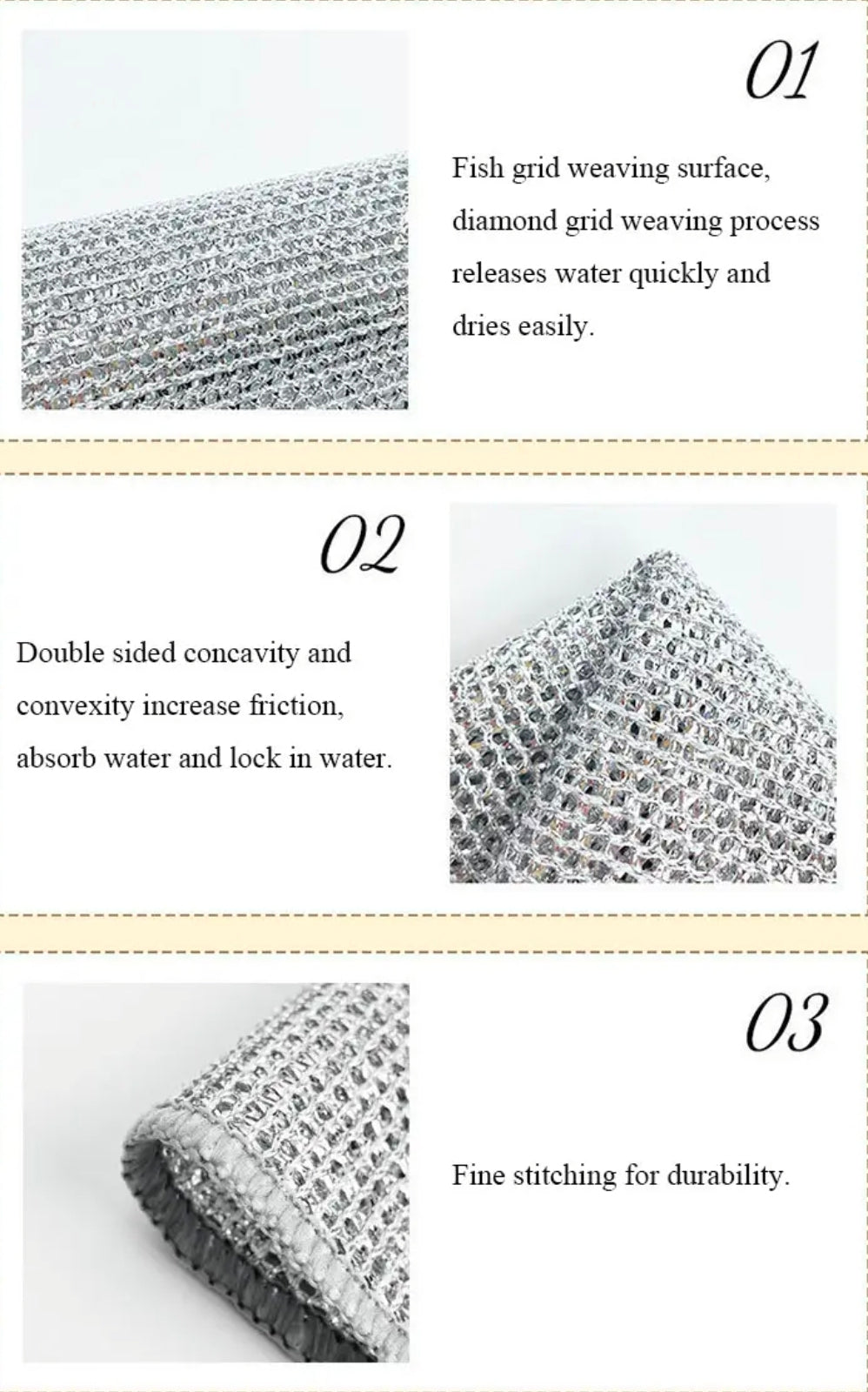 Silverwire klútarnir eru gerðir úr sérstökum vefnaði sem hleypir vatni auðveldlega í gegn og þornar fljótt. Yfirborðið er með mynstri sem eykur núningsflötinn og gerir klútinn sérstaklega hentugan til að ná burt fitu og erfiðum blettum. Tvöfalt lagið tryggir bæði góða vatnsupptöku og skilvirka hreinsun, jafnvel á yfirborðum sem eru með smáar holur eða rifur ásamt því að brúnirnar eru vandlega saumaðar til að standast endurtekna notkun og lengingu á endingartíma hvers klúts. Þeir eru hannaðir til að bíta vel á öllum yfirborðum án þess að skaða þá og eiga heima á hverju heimili til að auðvelda þrifin.