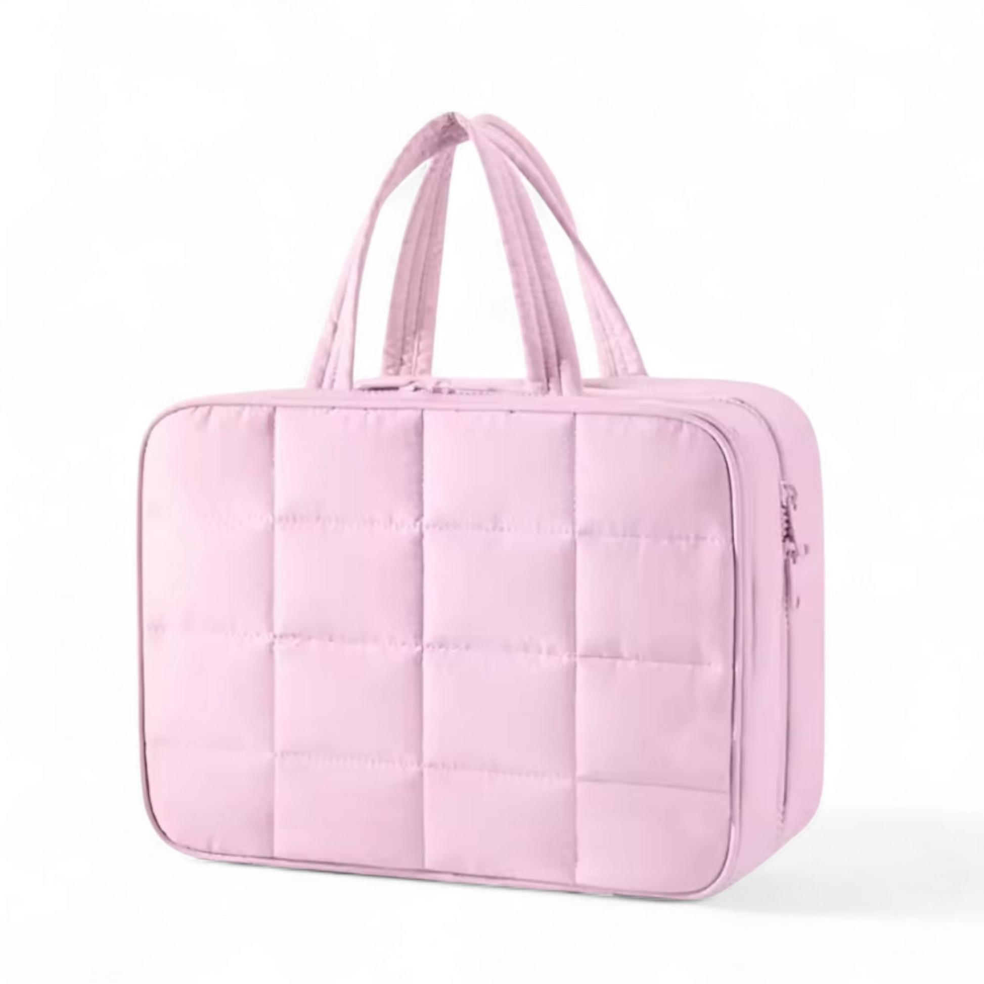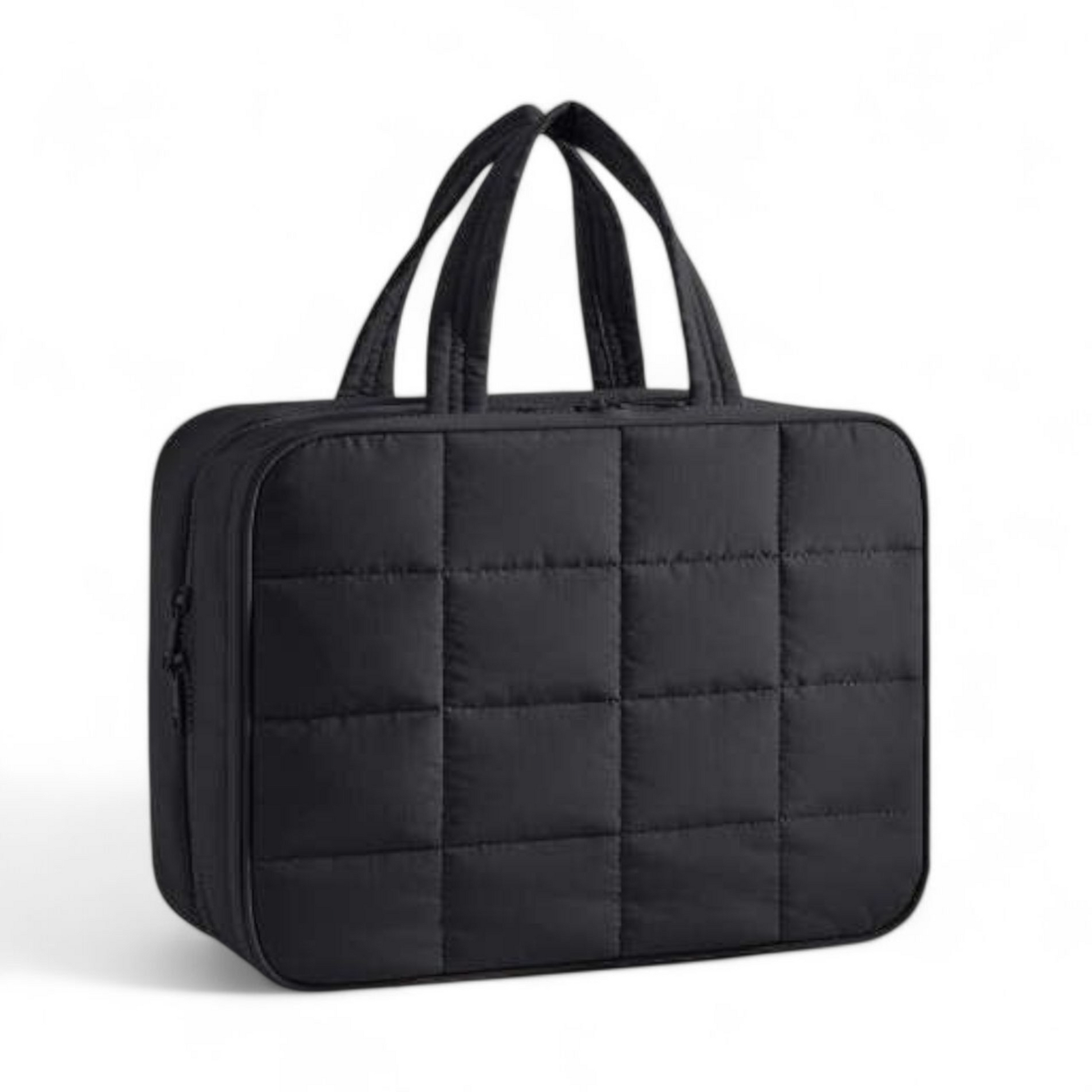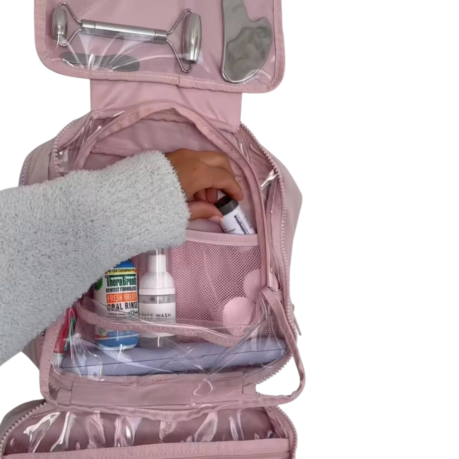 Rúmmikil og skipulögð snyrtitaska sem bíður ekki einungis uppá þrefalda opnun, heldur einnig opnun að framanverðu fyrir skartgripi eða aðra smáhluti. Taskan kemur með hengi svo hægt sé að hengja hana upp og sjá auðveldlega hvað innihaldið er með gegnsæum hólfum. Hún er svo með fallegu bólstruðu útliti sem gefur henni sterkan og fágaðan svip.