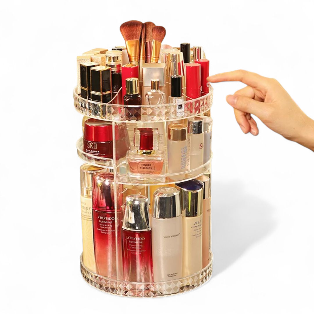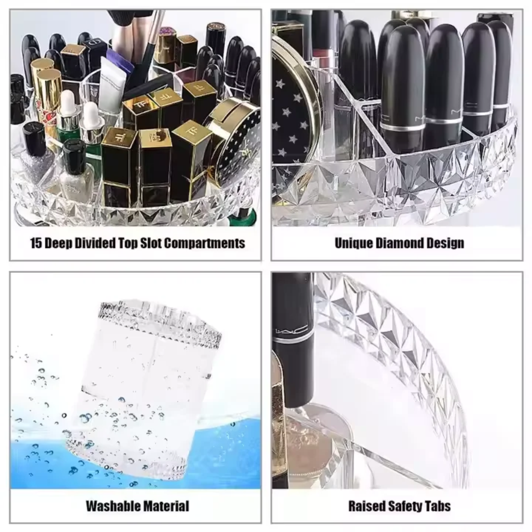Glæsilegur snyrtivörustandur úr sterkbyggðum gegnsæjum akrýl sem sameinar skipulag, stíl og þægindi. Hann kemur í einingum sem auðvelt er að setja saman og stilla eftir þínum þörfum. Með 360 gráðu snúningi færðu greiðan aðgang að öllum snyrtivörunum þínum með einu handtaki. Diamond hönnunin á efri og neðri pall gefur honum lúxus yfirbragð á meðan sterkbyggðar akrýl einingarnar tryggja stöðugleika og endingu.