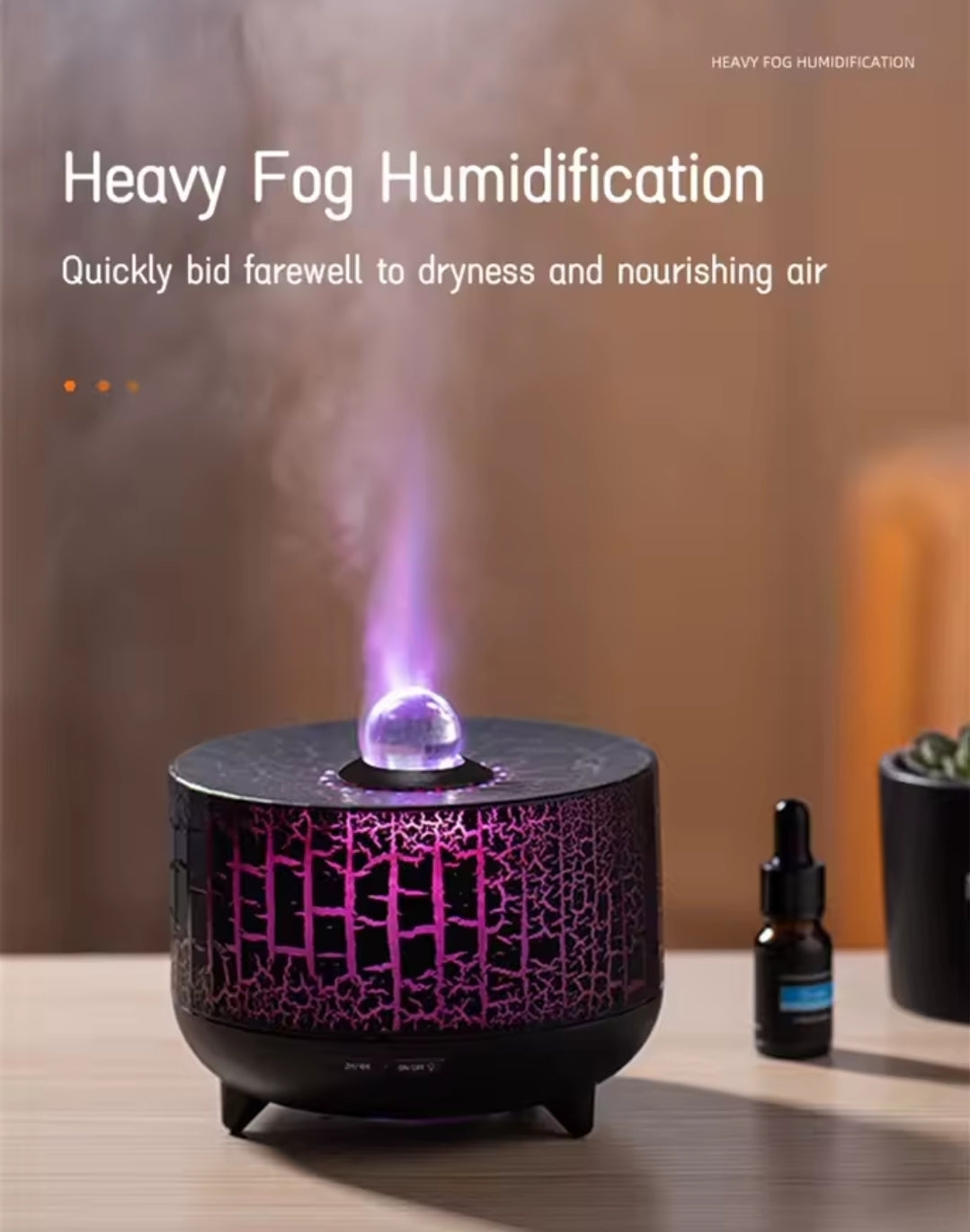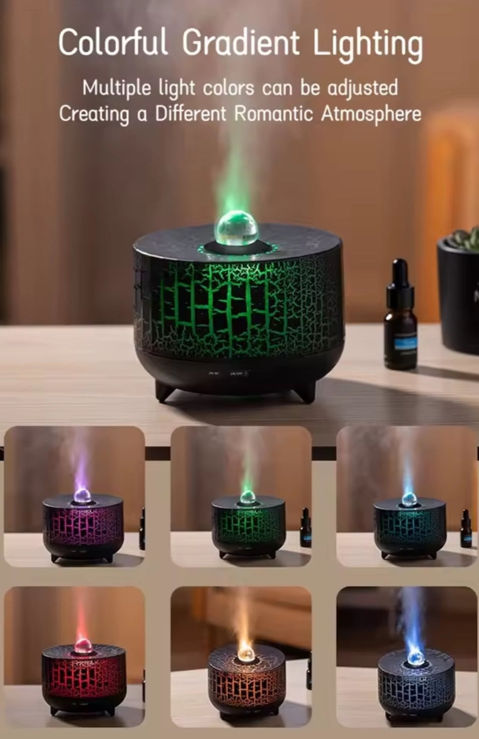 Fallega hannað rakatæki sem lýsist útfrá brotamunstri á tækinu og líkir hvað mest eftir gjósandi eldfjalli. Það býður upp á sjö mismunandi LED lýsingar, þrjár kraftstillingar og tvær tímalæsingar sem auðvelt er að stjórna með fjarstýringu. Með 230 ml tank getur tækið gefið rakabætandi loft klukkustundum saman án þess að tæmast. Það hentar svo bæði sem raka og ilmolíulampi til að skapa friðsælt og ilmandi andrúmsloft.