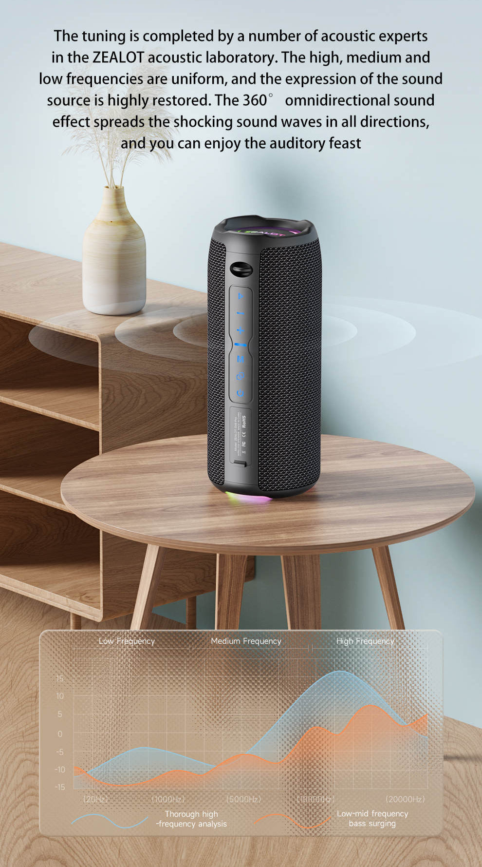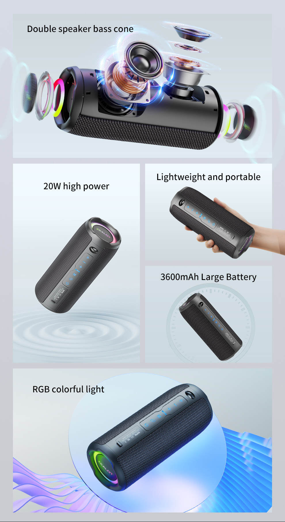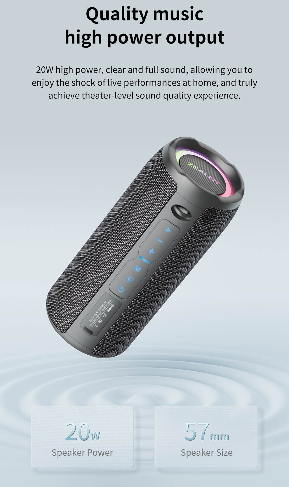 Zealot S49 PRO er ferðafélagi sem pakkar miklu í litla umgjörð. Hann sameinar öflugan 20W surround hljóm með tvöfaldri bassakeilu sem gefur dýpt og kraft í tónlistina, sama hvort þú ert heima, í ferðalagi eða úti í náttúrunni. Hátalarinn bíður uppá 5.2 bluetooth tengingu sem tryggir hraða og stöðuga tengingu ásamt því að 3600mAh batteríið sér til þess að tónlistin spili snurðulaust í allt að 8 klukkustundir og mánuð í biðstöðu. Hann er nettur, með sterku nylon yfirborði og handfangi sem gerir hann fullkominn til að grípa með sér í útilegur, fjallgöngur eða einfaldlega á pallinn.
